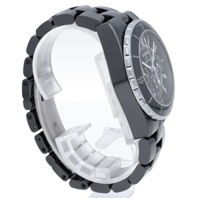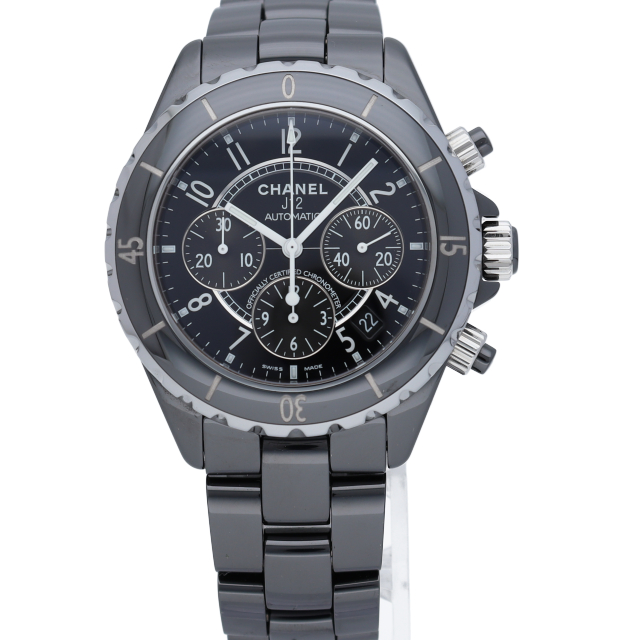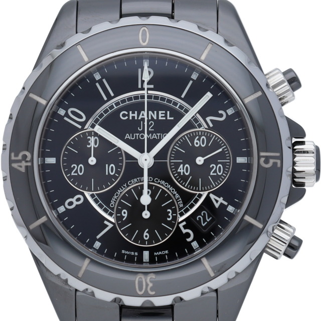 シャネルの人気フラッグシップウォッチで「J12」。異素材で傷がつきにくく独特な光沢感をもつセラミックをうまくデザインに融合させた1本。クロノグラフ搭載。