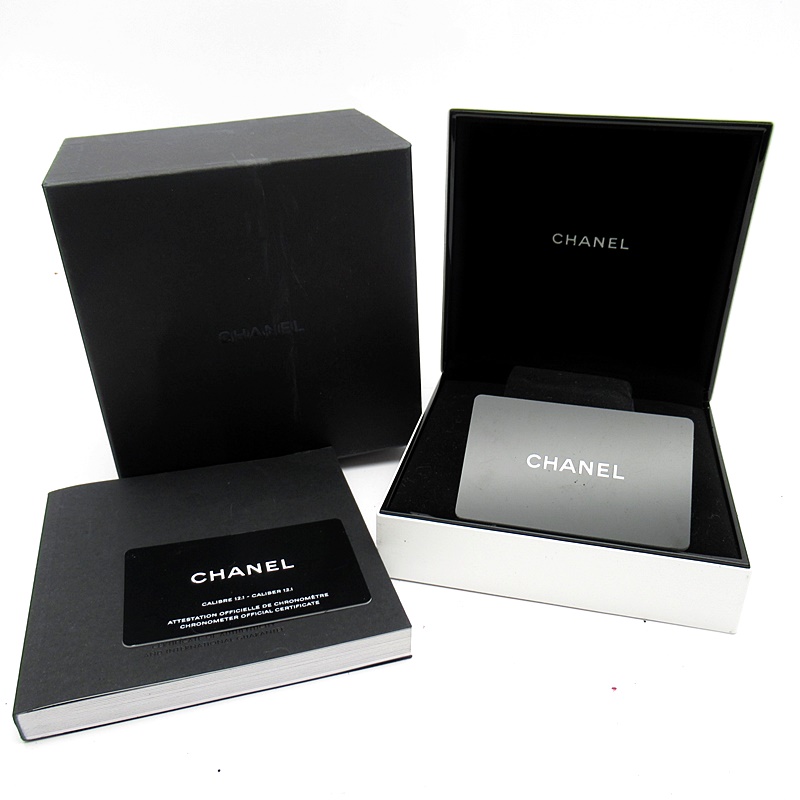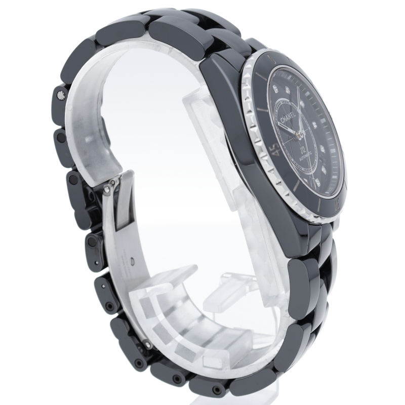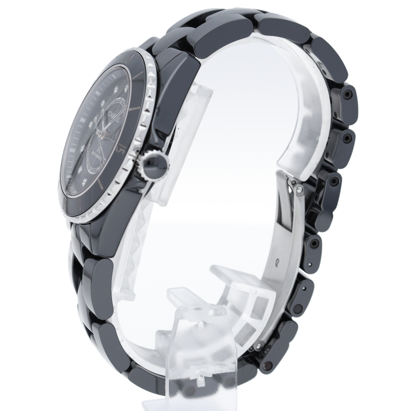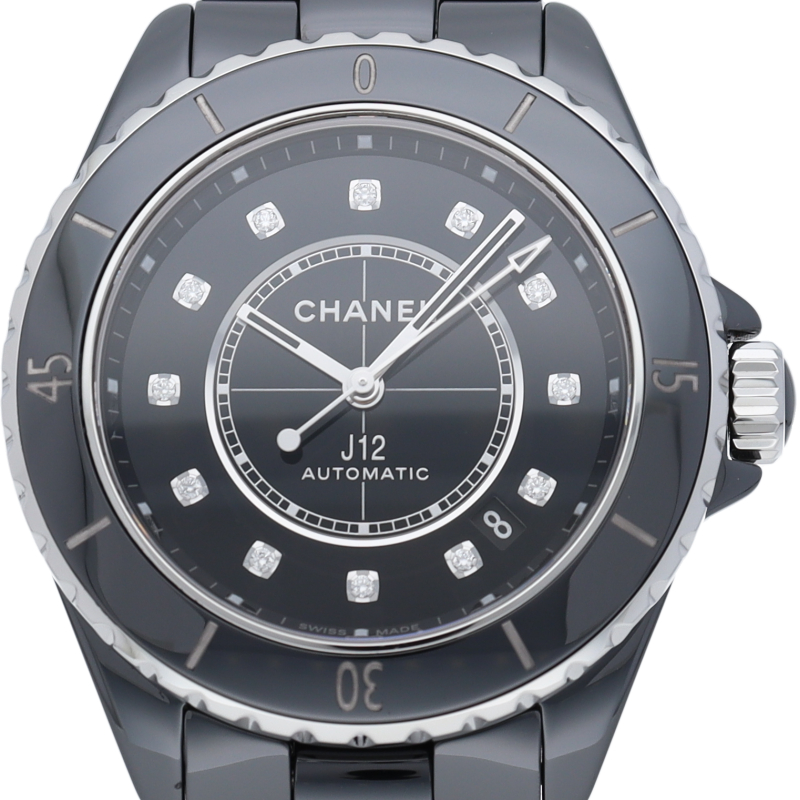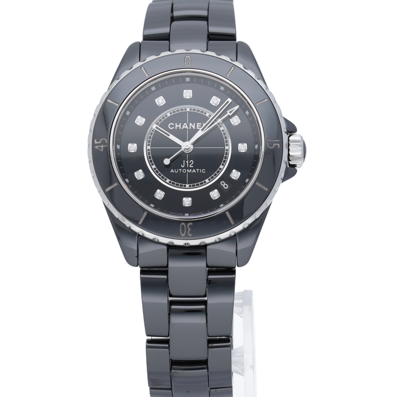 逆回転防止ベゼルやねじ込み式リューズを備えた厚さ12ミリの38ミリ200m防水ケース&3連ブレスに耐傷性に優れたブラックセラミックを採用したJ12は、美しい光沢が長持ちして使い勝手に優れるシャネル人気のタイムピース。キャリバー12.1自動巻きムーブメントを搭載して4時30分の窓に日付を表示します。ブラックダイヤルに12粒のダイヤモンド(0.09ct)があしらわれています。