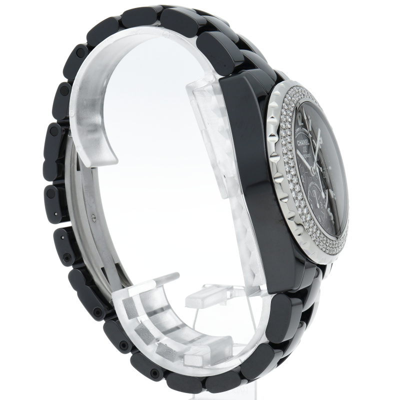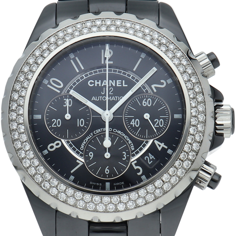 シャネルの人気フラッグシップウォッチで「J12」。異素材で傷がつきにくく独特な光沢感をもつセラミックをうまくデザインに融合させた1本。ベゼルには2重に施されたダイヤモンドが豪華です。クロノグラフ搭載。
