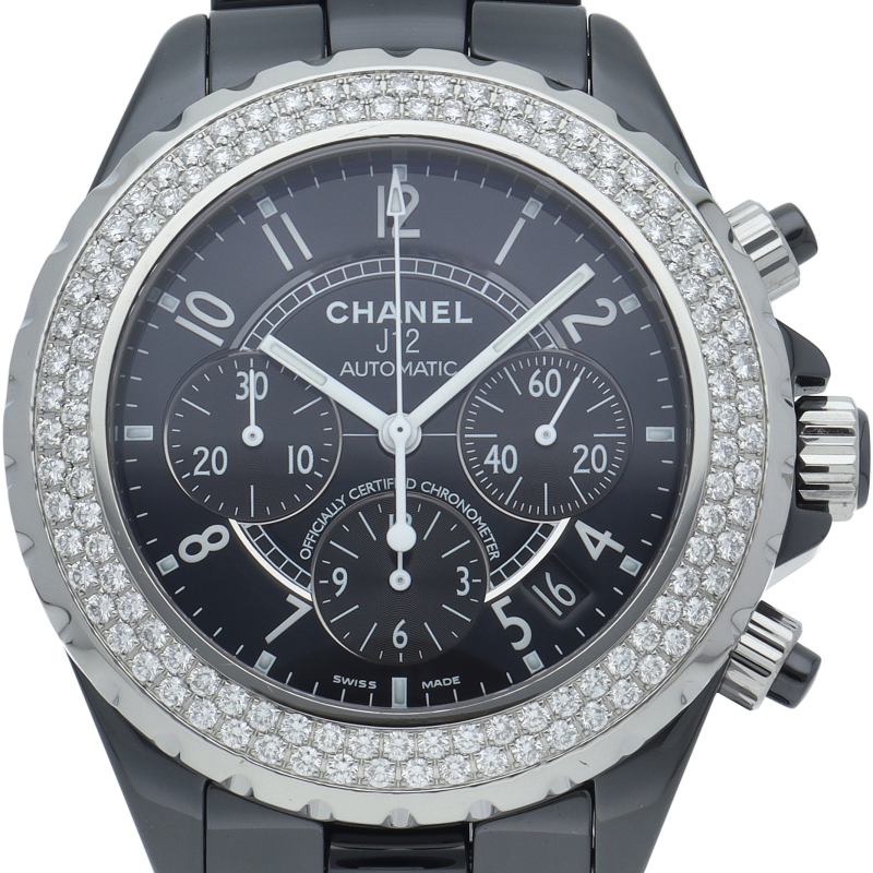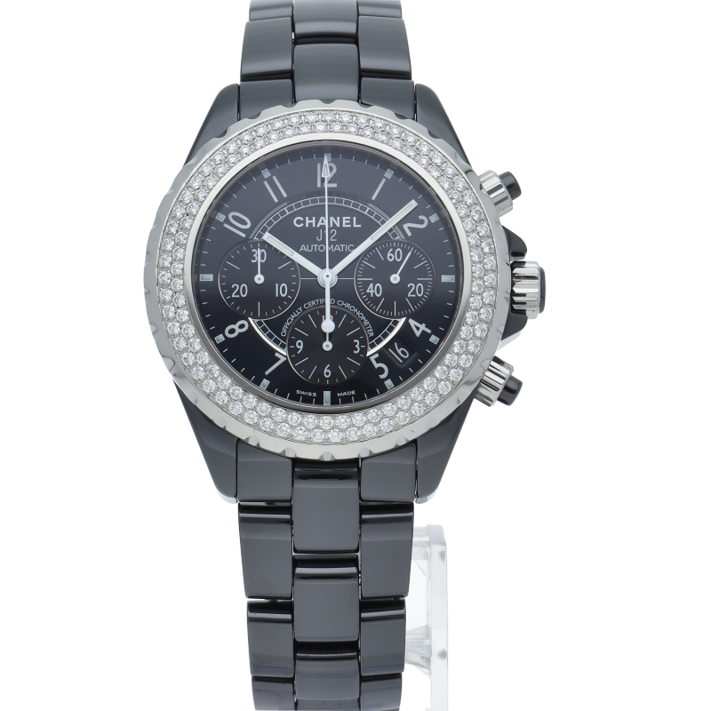 シャネルの人気フラッグシップウォッチで「J12」。異素材で傷がつきにくく独特な光沢感をもつセラミックをうまくデザインに融合させた1本。ベゼルには2重に施されたダイヤモンドが豪華です。クロノグラフ搭載。