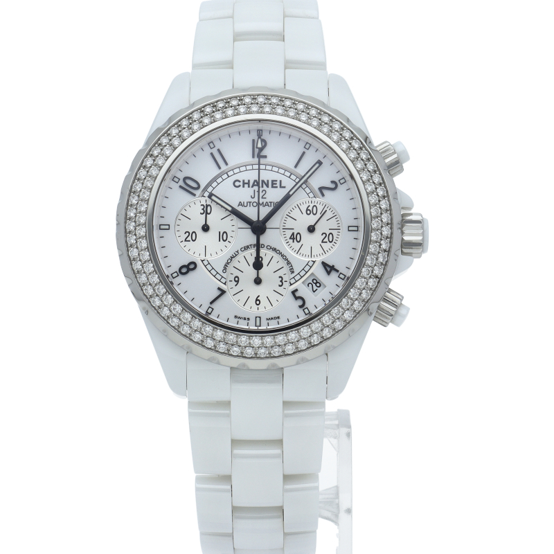 シャネルの人気フラッグシップウォッチ「J12」。異素材で傷がつきにくく独特な光沢感をもつセラミックをうまくデザインに融合させた1本。ベゼルには2重に施されたダイヤモンドが豪華です。クロノグラフ搭載。