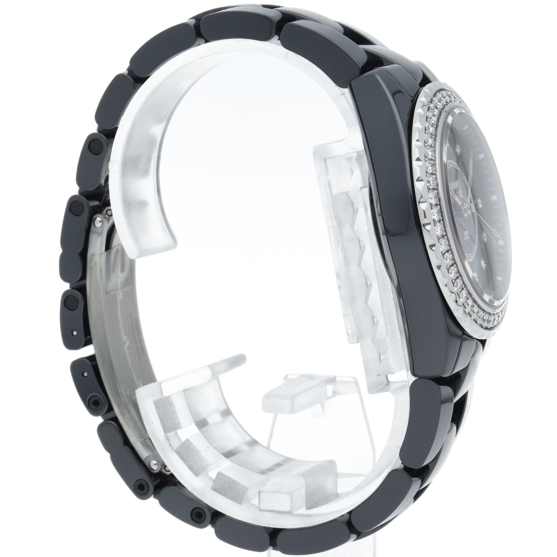 シャネルの人気フラッグシップウォッチで「J12」。異素材で傷がつきにくく独特な光沢感をもつセラミックをうまくデザインに融合させた1本。ベゼルには2重に施されたダイヤモンドが豪華です。クロノグラフ搭載。
