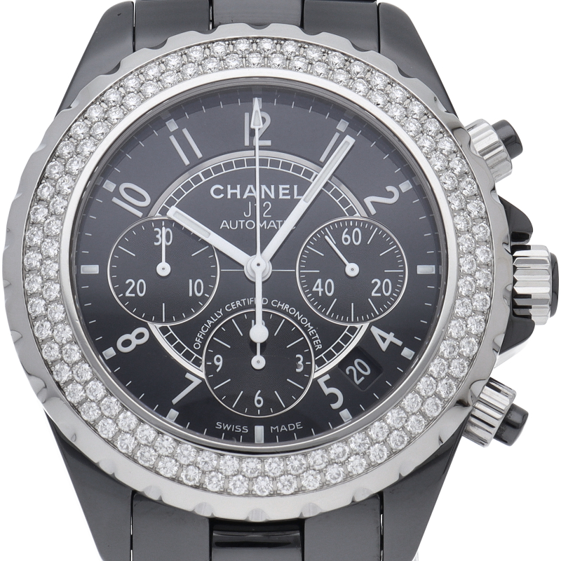 シャネルの人気フラッグシップウォッチで「J12」。異素材で傷がつきにくく独特な光沢感をもつセラミックをうまくデザインに融合させた1本。ベゼルには2重に施されたダイヤモンドが豪華です。クロノグラフ搭載。