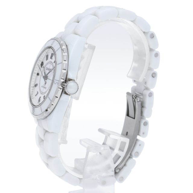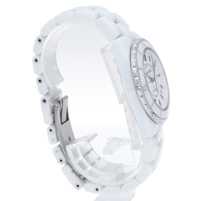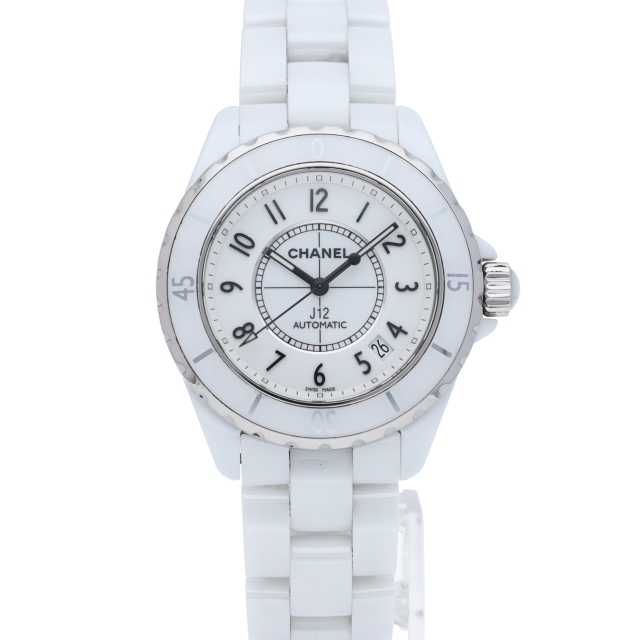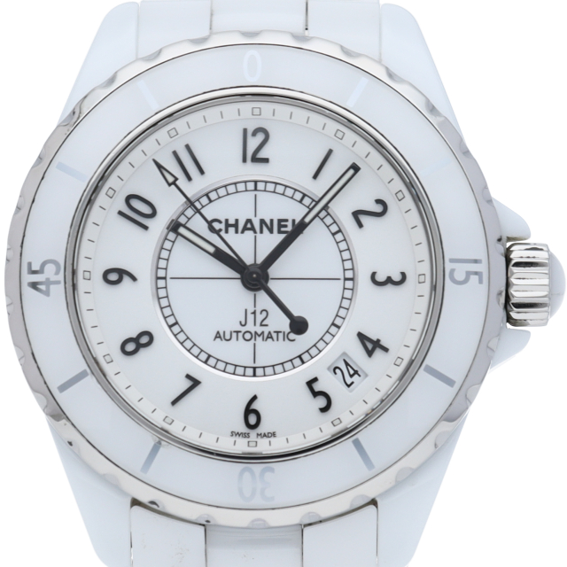 シャネルの人気フラッグシップウォッチで「J12」。異素材で傷がつきにくく独特な光沢感をもつセラミックをうまくデザインに融合させた1本。