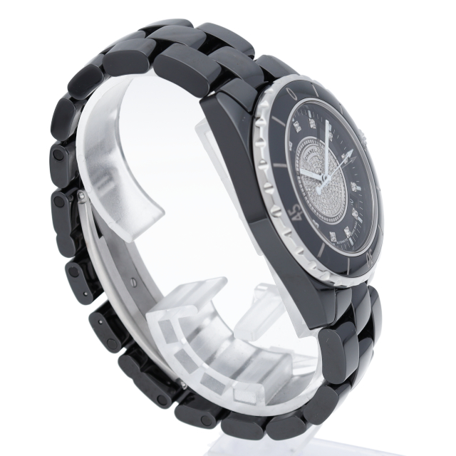 シャネルの人気フラッグシップウォッチで「J12」。異素材で傷がつきにくく独特な光沢感をもつセラミックを使用、文字盤中央にはメーカー純正の110個のダイヤとインデックスに12Pダイヤが施された高級感ある1本。