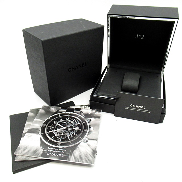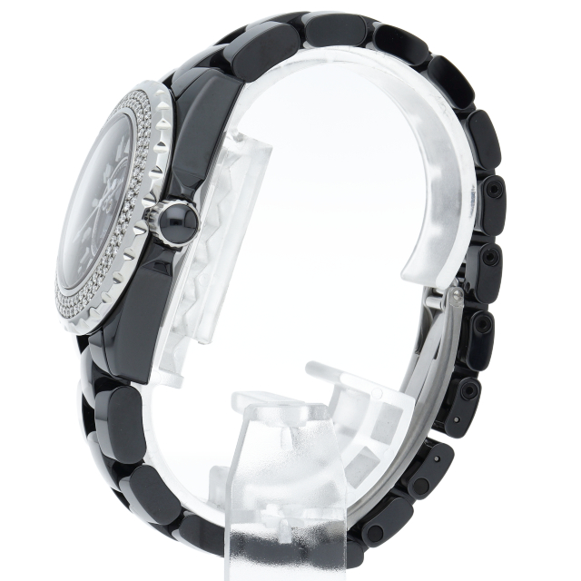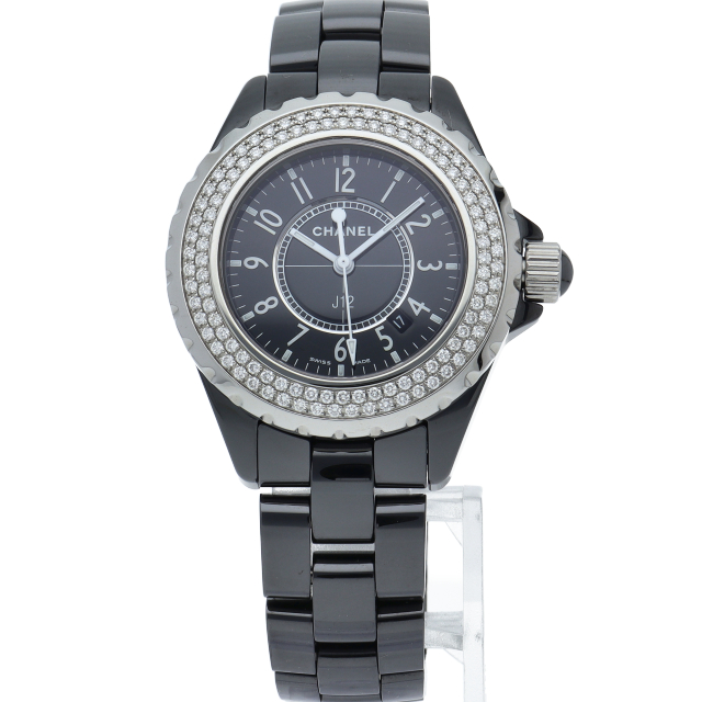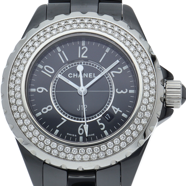 シャネルの人気シリーズ「J12」。独特な光沢感を持つセラミックを使用、スポーティで高級感溢れる1本。ベゼルには2重に施されたダイヤモンドが豪華です。