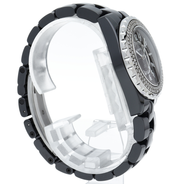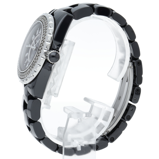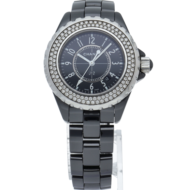 シャネルの人気シリーズ「J12」。独特な光沢感を持つセラミックを使用、スポーティで高級感溢れる1本。ベゼルには2重に施されたダイヤモンドが豪華です。