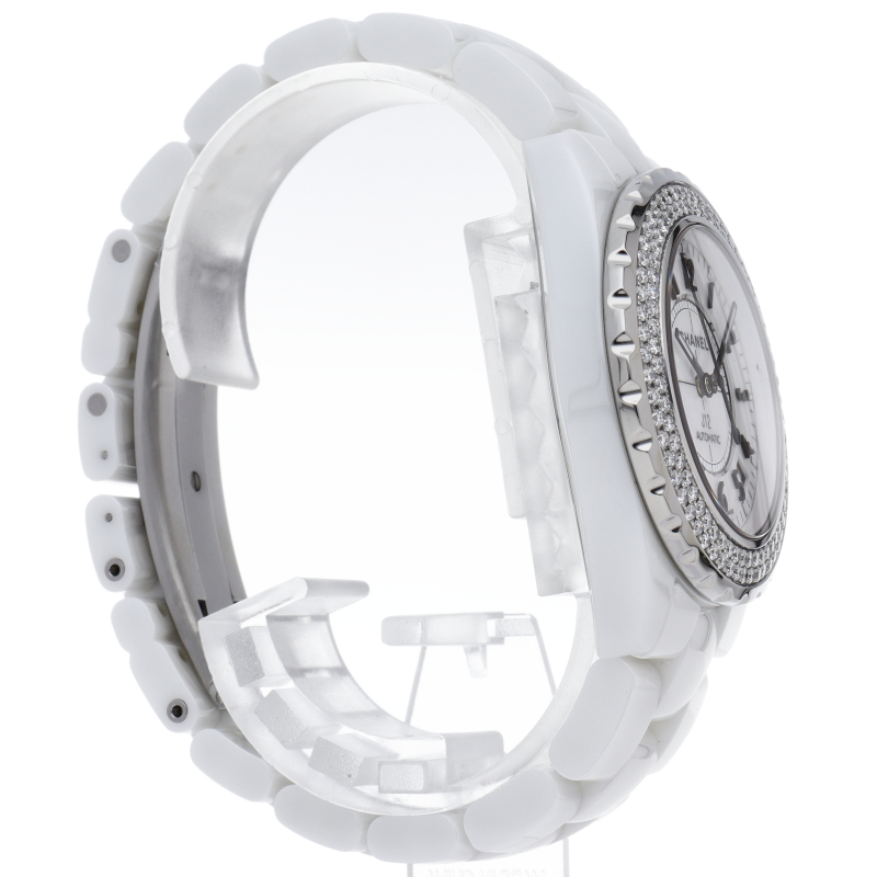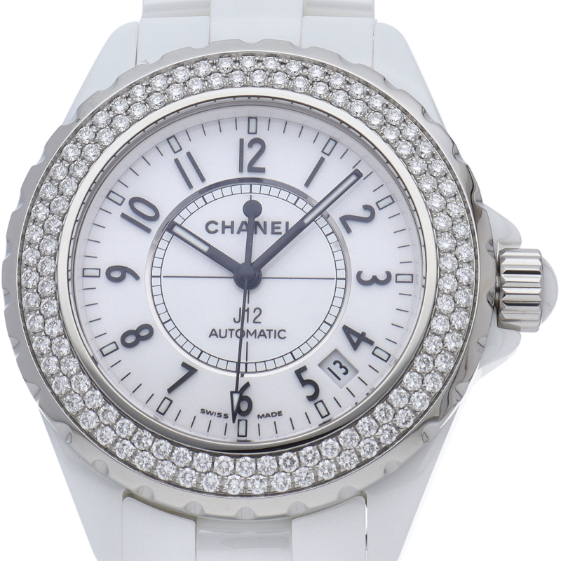 シャネルの人気シリーズ「J12」。独特な光沢感を持つセラミックを使用、スポーティで高級感溢れる1本。ベゼルには2重に施されたダイヤモンドが豪華です。