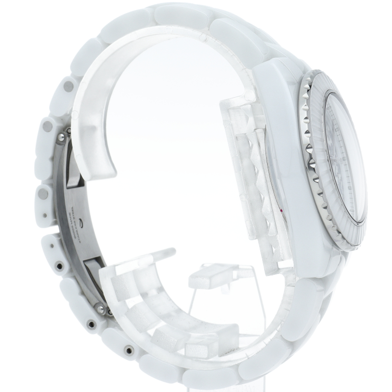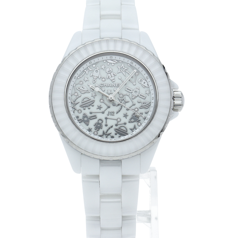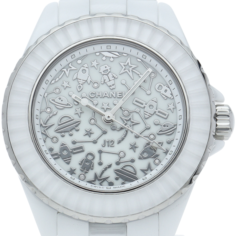CHANELの21世紀のアイコンウォッチと称されている「J12」の限定モデル「H7990 コズミック」。SFの世界、宇宙、時間旅行からインスピレーション得て誕生した「シャネル インターステラー カプセル コレクション」で、青色発光のスーパールミノバを塗布したホワイト ダイヤルに宇宙を連想させるロケットやUFO、星に加えココシャネルをデザイン。また12個のブリリアントカット ダイヤモンドが散りばめられています。