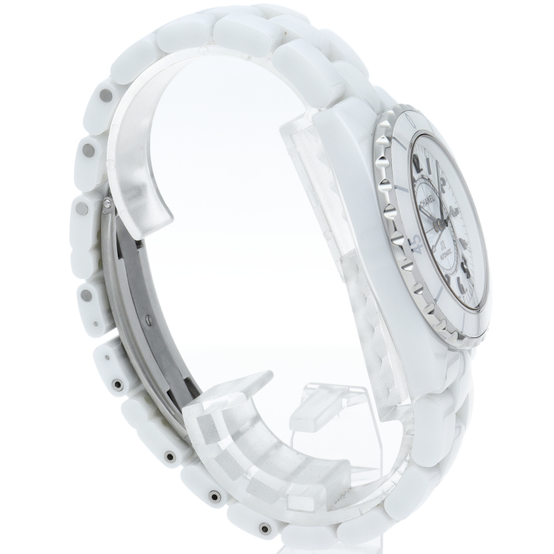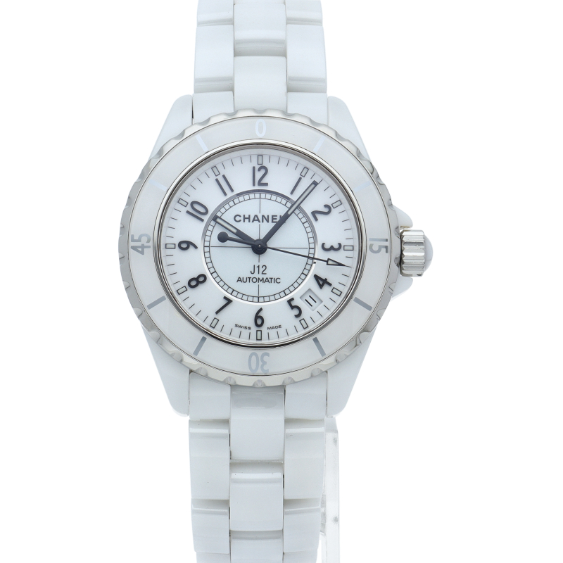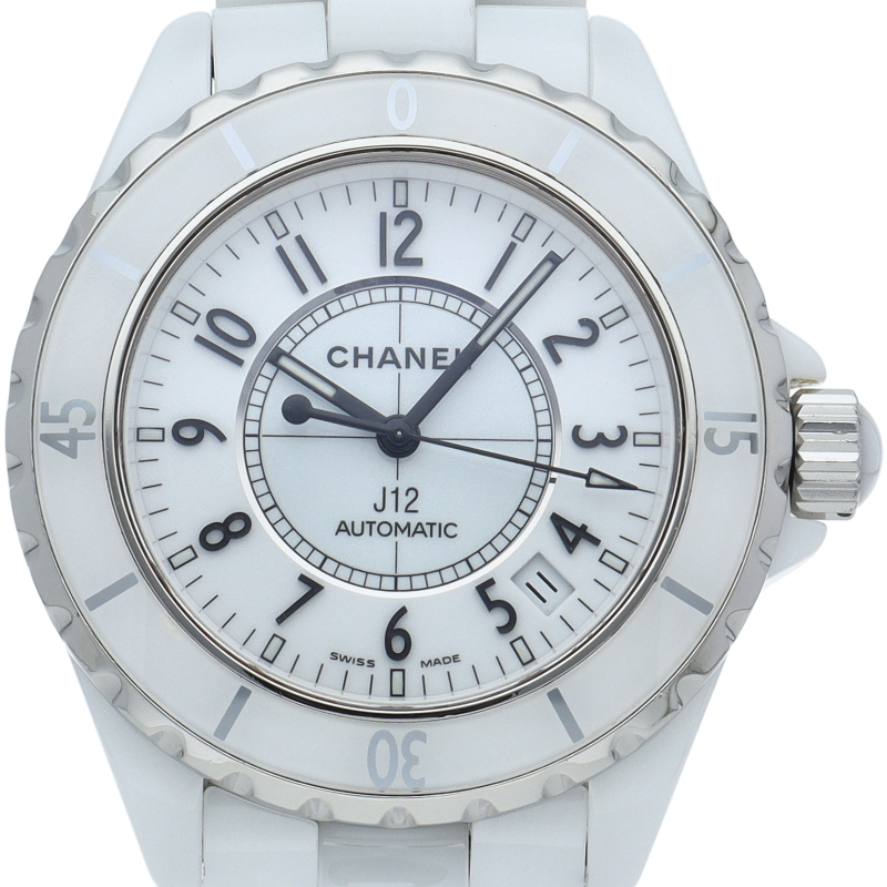 シャネルの人気フラッグシップウォッチで「J12」。異素材で傷がつきにくく独特な光沢感をもつセラミックをうまくデザインに融合させた1本。