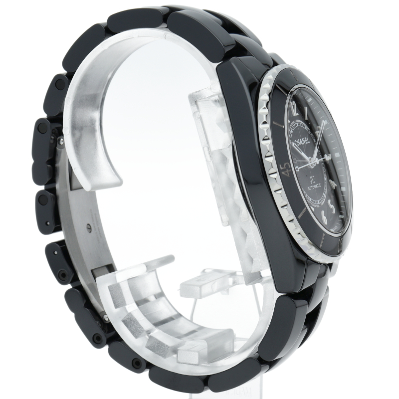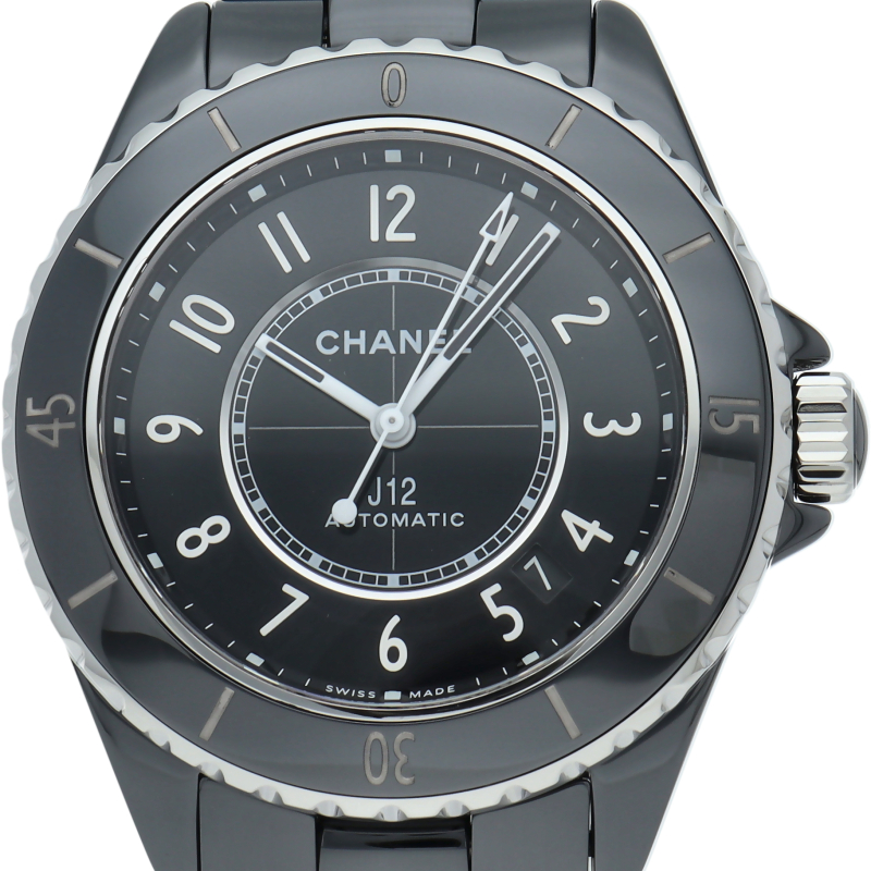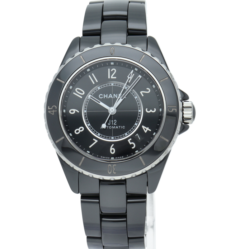 シャネルの人気フラッグシップウォッチで「J12」。異素材で傷がつきにくく独特な光沢感をもつセラミックをうまくデザインに融合させた1本。ムーブメントには高精度で70時間のロングパワーリザーブを確保した自社開発キャリバー12.1を搭載しています。