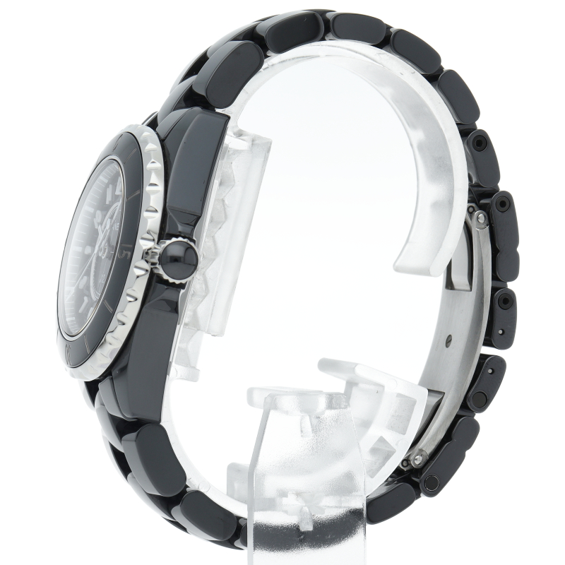 シャネルの人気フラッグシップウォッチで「J12」。異素材で傷がつきにくく独特な光沢感をもつセラミックとラバーをうまくデザインに融合させた1本。