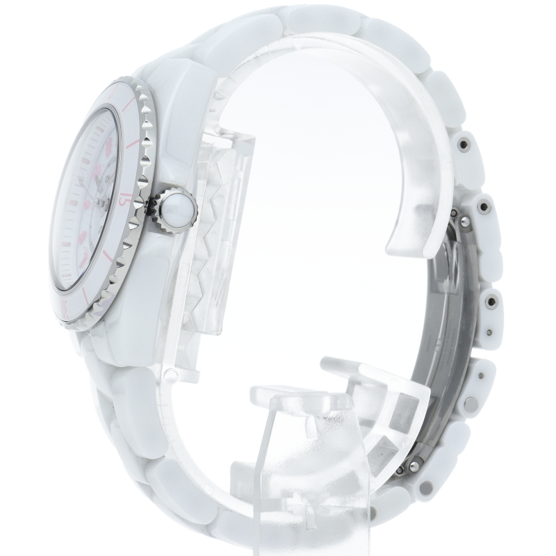 高級時計に初めてセラミックを取り入れたシャネルを代表する素材のホワイト・セラミックを用いてインデックスや針、ベゼルスケール部分にもフェミニンなピンクカラーを採用した表現した世界1200本の限定モデルです。