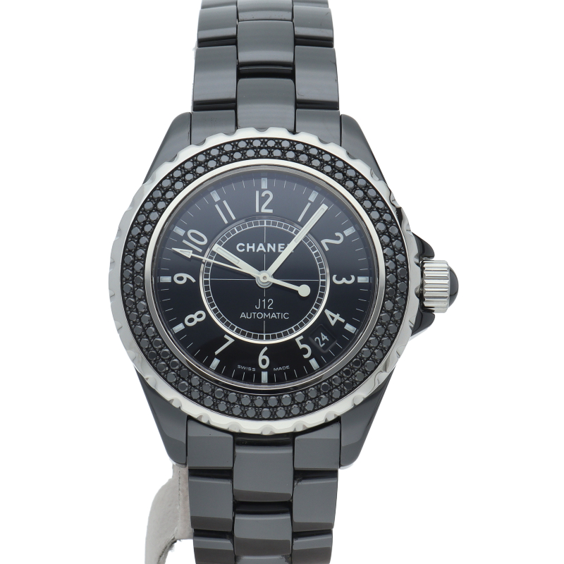 シャネルの人気シリーズ「J12」。独特な光沢感を持つセラミックを使用、スポーティで高級感溢れる1本。ベゼルには2重に施されたダイヤモンドが豪華です。