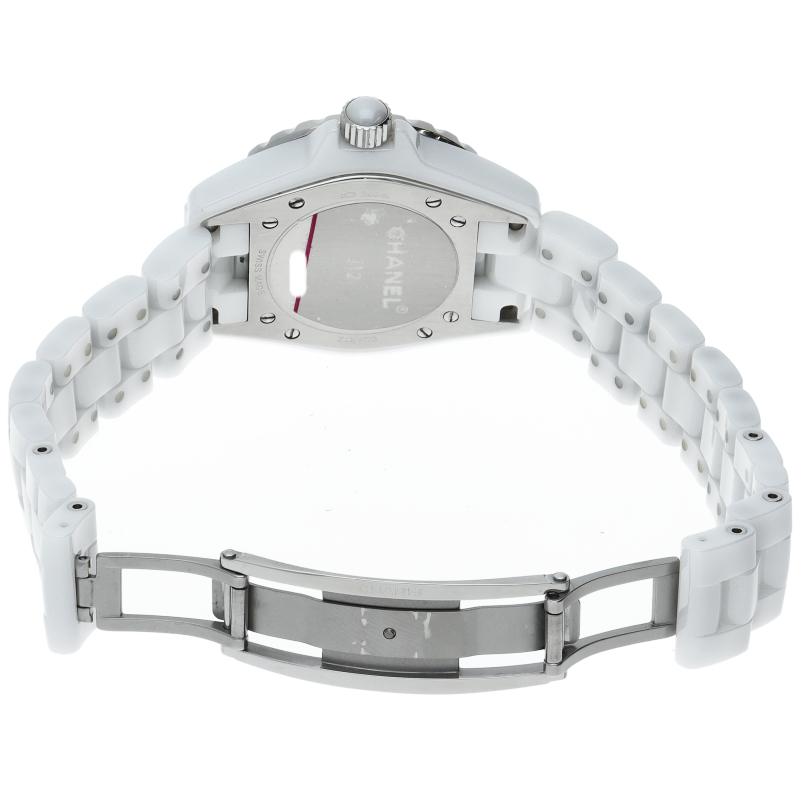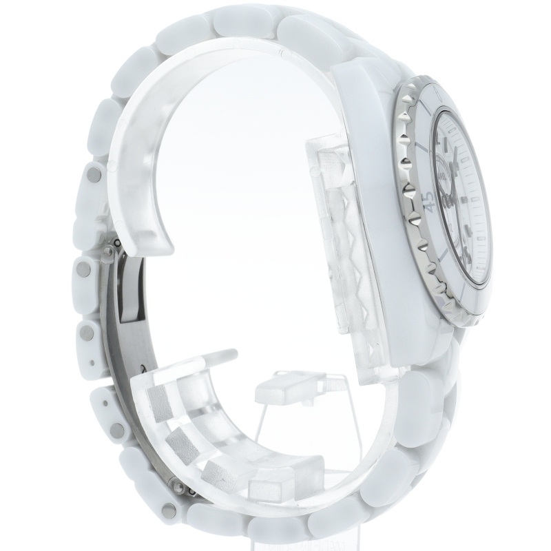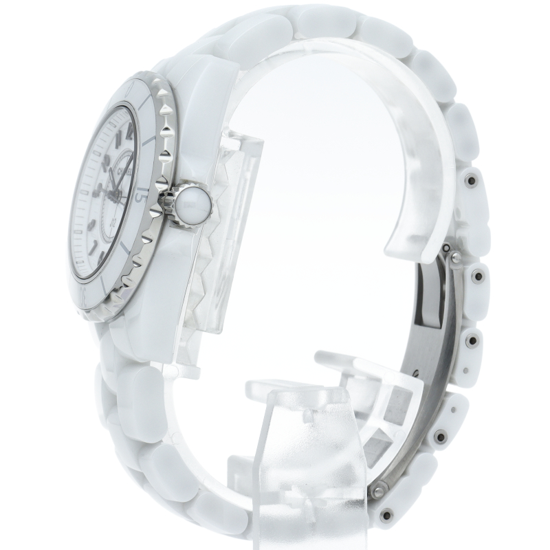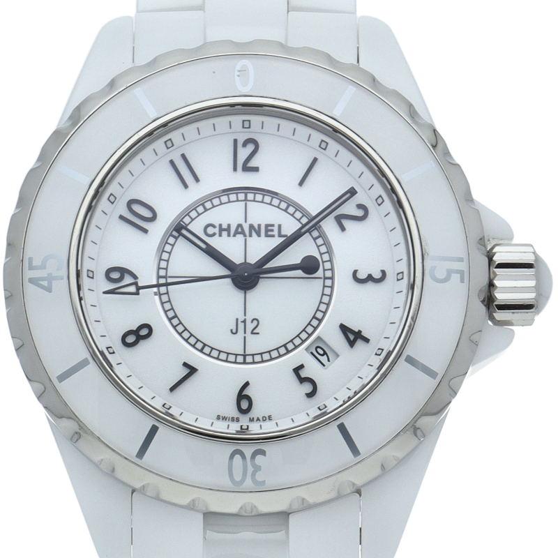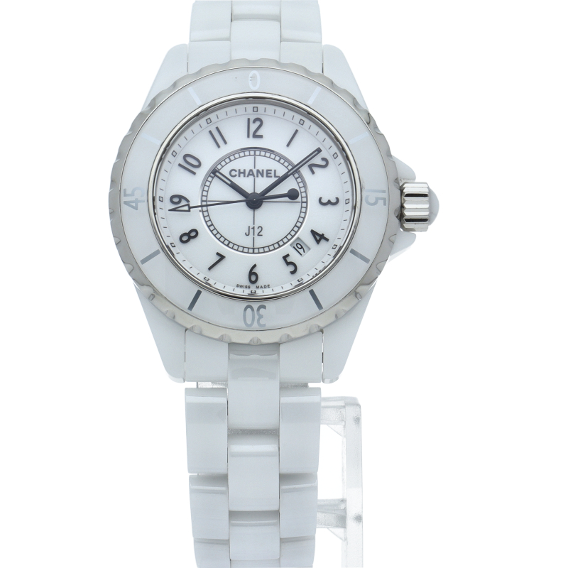 シャネルの人気フラッグシップウォッチで「J12」。異素材で傷がつきにくく独特な光沢感をもつセラミックをうまくデザインに融合させた1本。