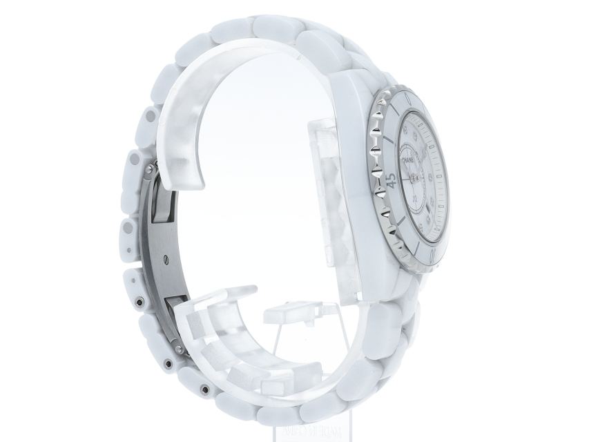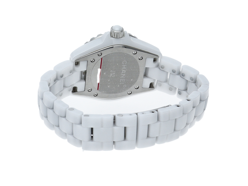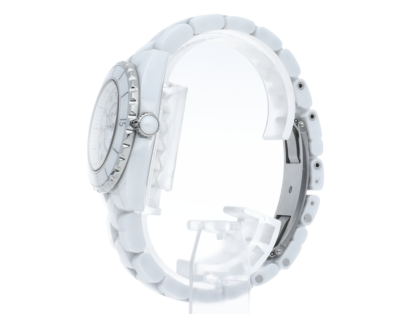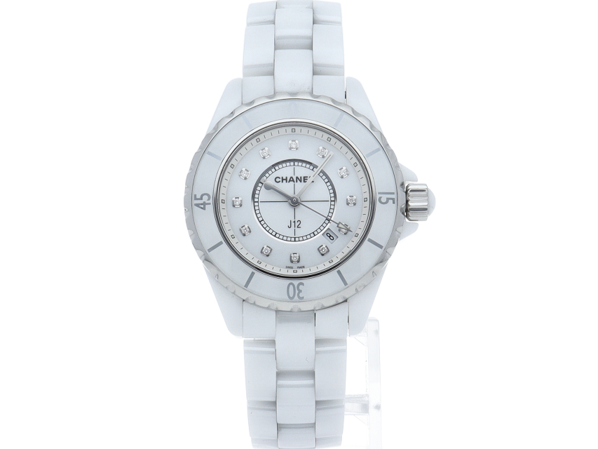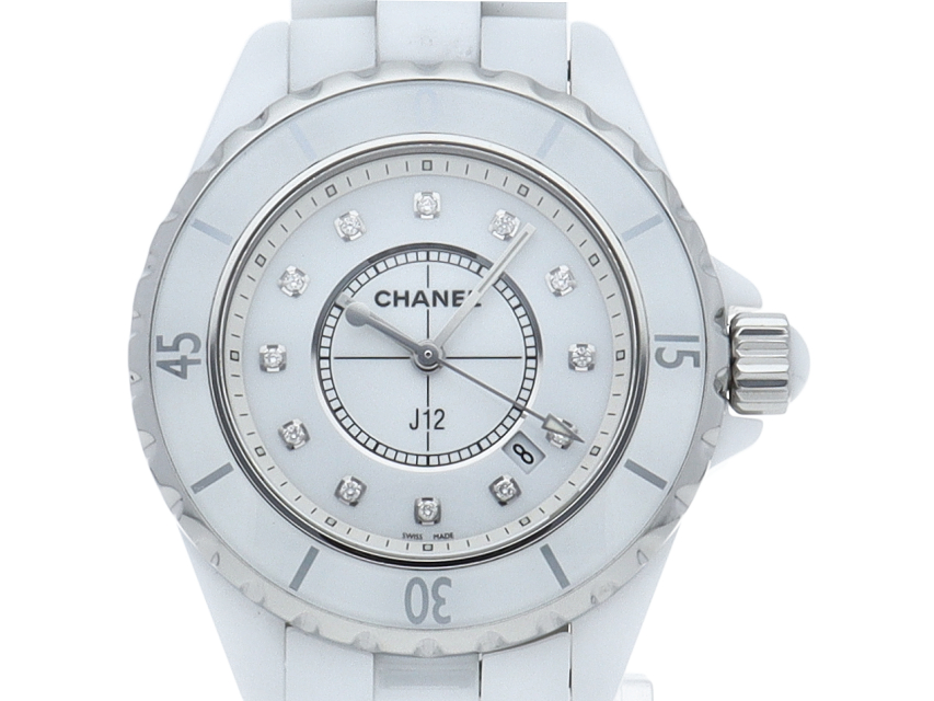 シャネルの人気フラッグシップウォッチで「J12」。異素材で傷がつきにくく独特な光沢感をもつセラミックをうまくデザインに融合させた1本。12Pダイヤモンド。