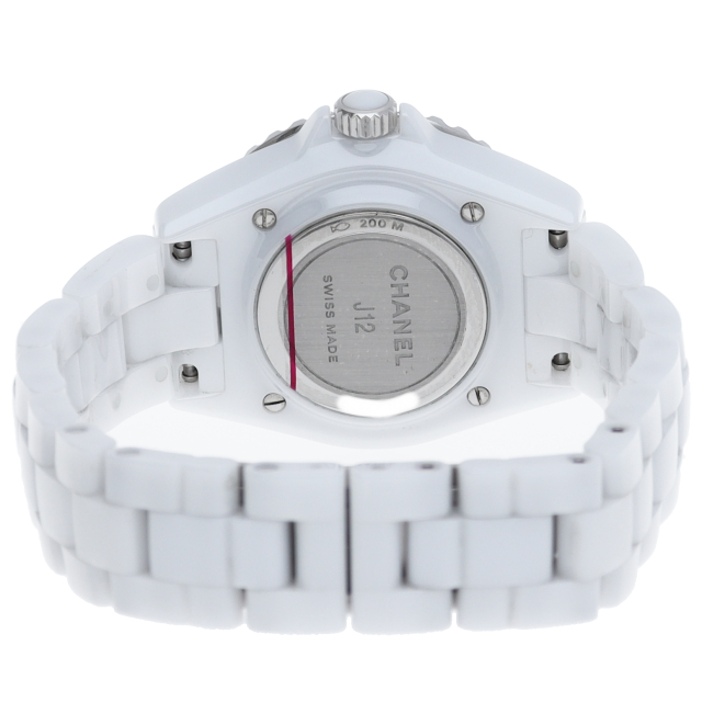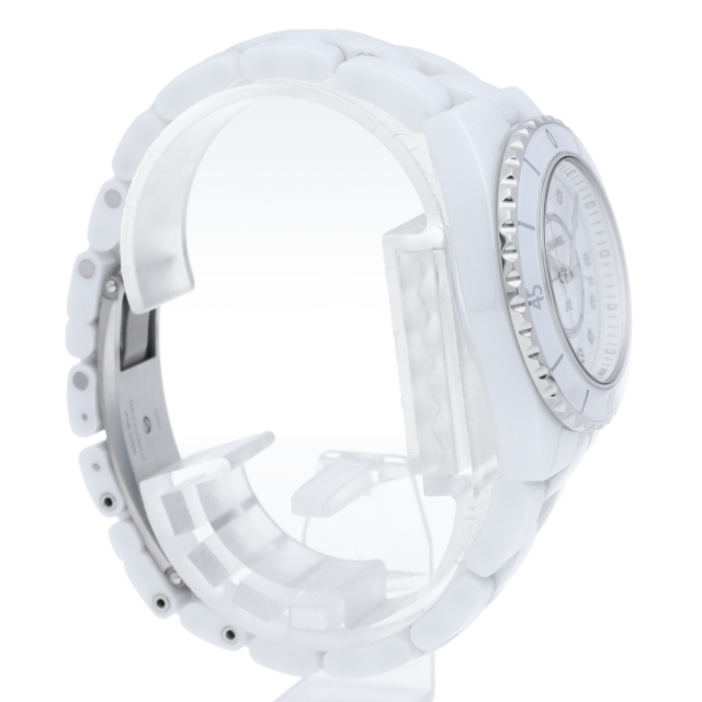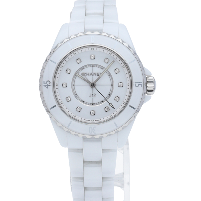 シャネルの人気フラッグシップウォッチで「J12」。異素材で傷がつきにくく独特な光沢感をもつセラミックをうまくデザインに融合させた1本。ゴージャスなダイヤが目をひきます。