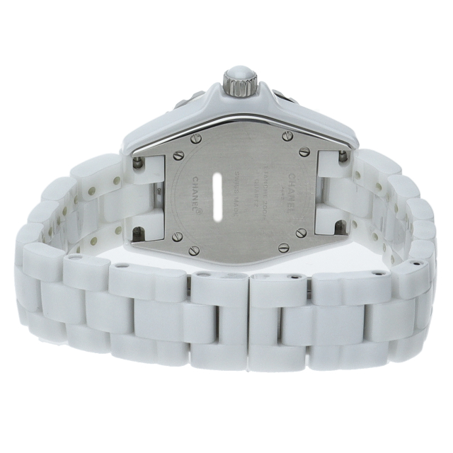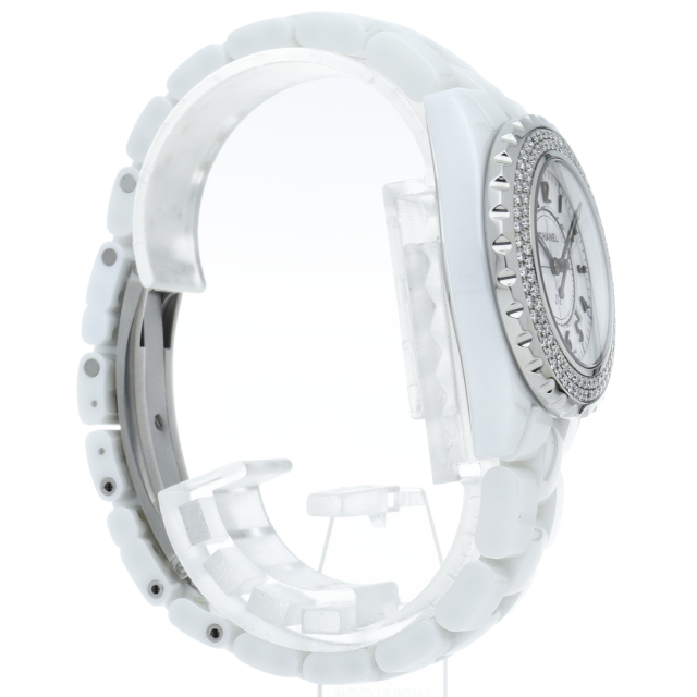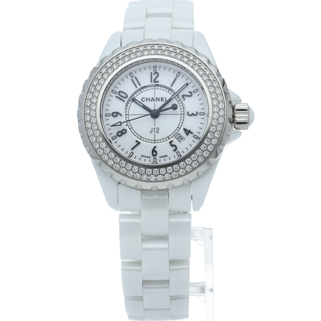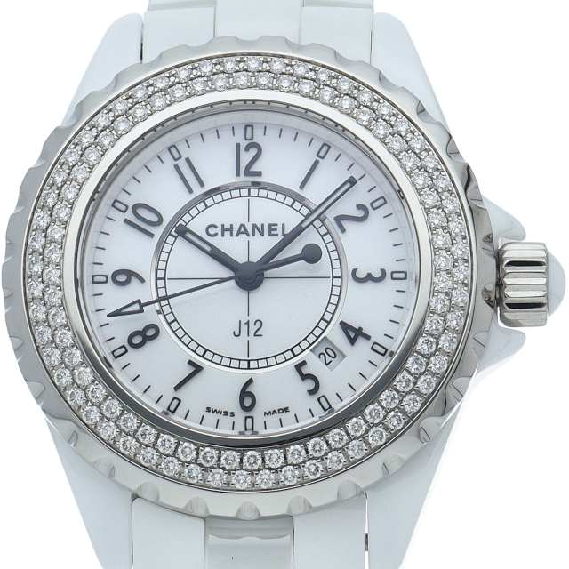 シャネルの人気フラッグシップウォッチで「J12」。異素材で傷がつきにくく独特な光沢感をもつセラミックをうまくデザインに融合させた1本。ゴージャスなベゼルダイヤが目をひきます。