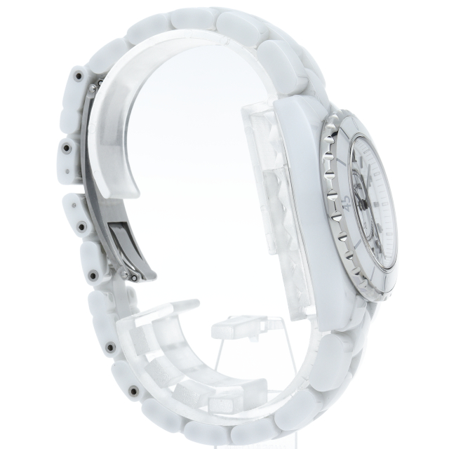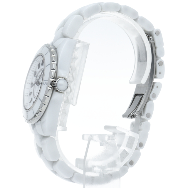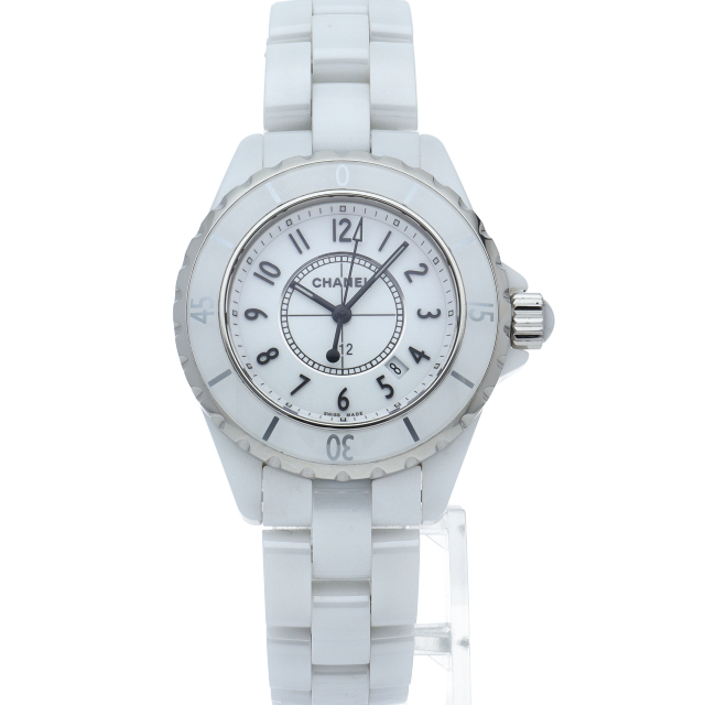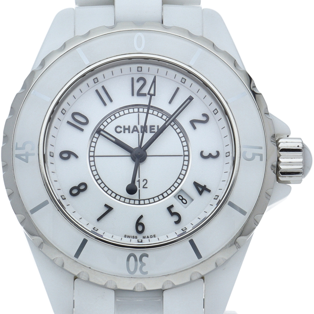 シャネルの人気フラッグシップウォッチで「J12」。異素材で傷がつきにくく独特な光沢感をもつセラミックをうまくデザインに融合させた1本。