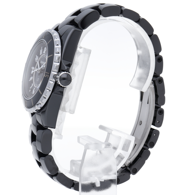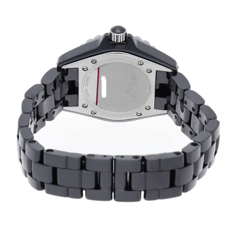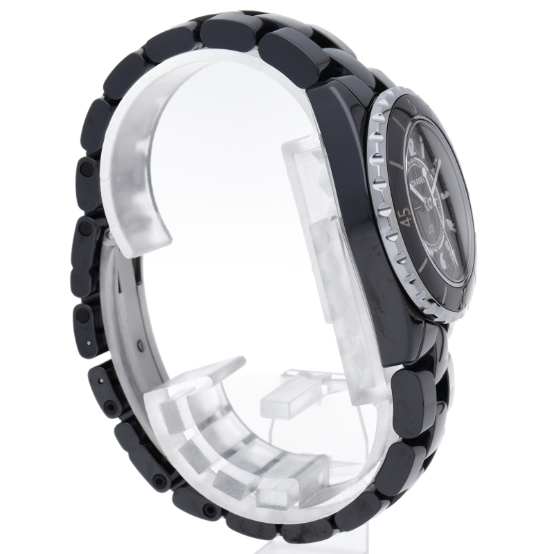 シャネルの人気フラッグシップウォッチで「J12」。異素材で傷がつきにくく独特な光沢感をもつセラミックとラバーをうまくデザインに融合させた1本。
