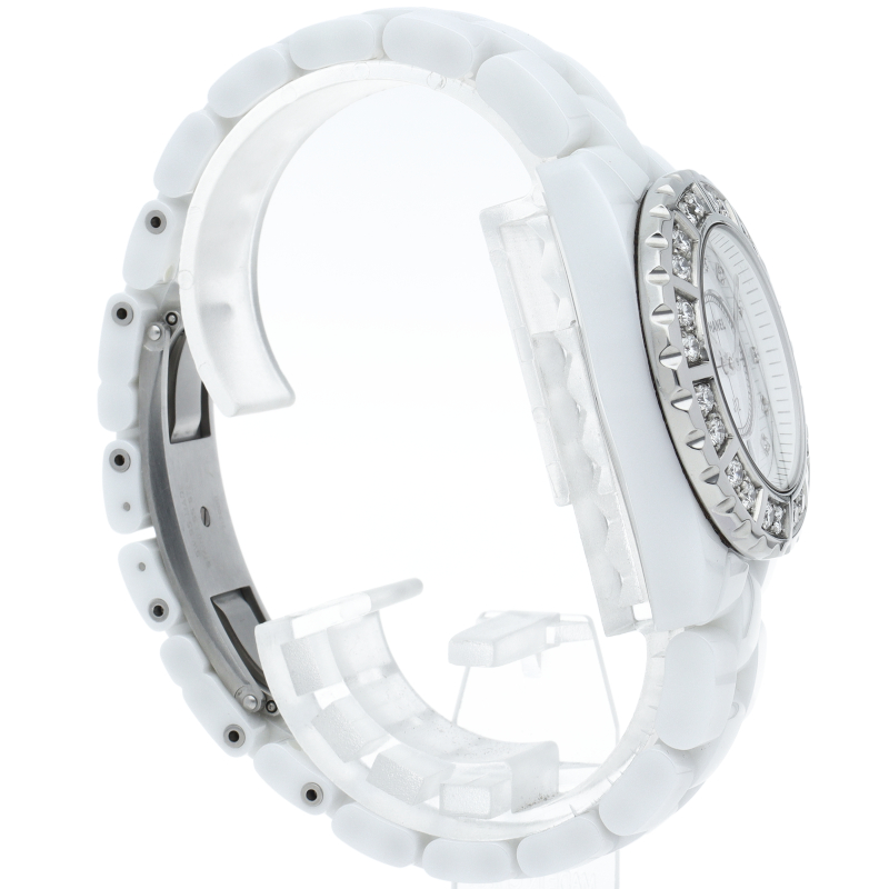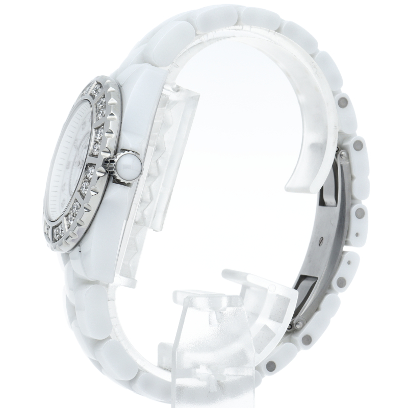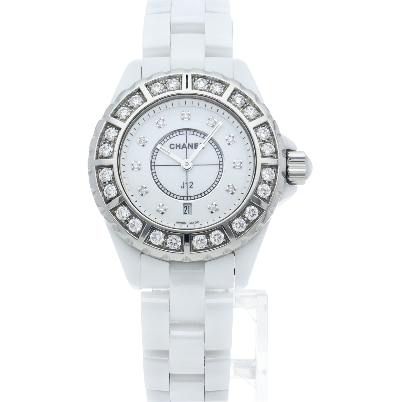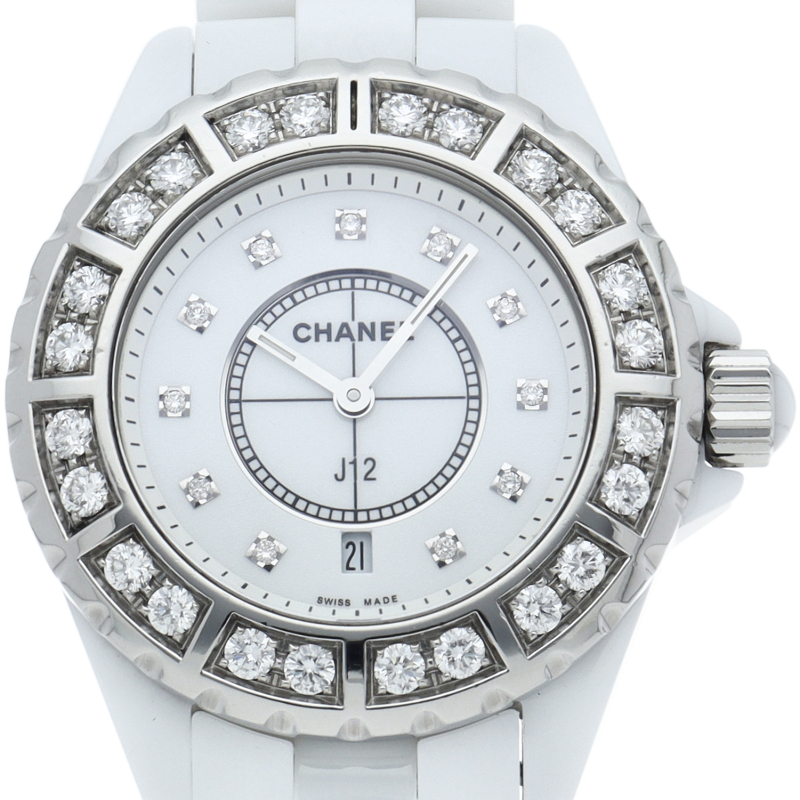 シャネルの人気フラッグシップウォッチで「J12」。異素材で傷がつきにくく独特な光沢感をもつセラミックをうまくデザインに融合させた1本。11Pダイヤモンド。