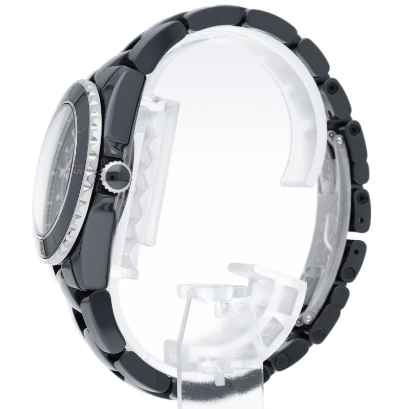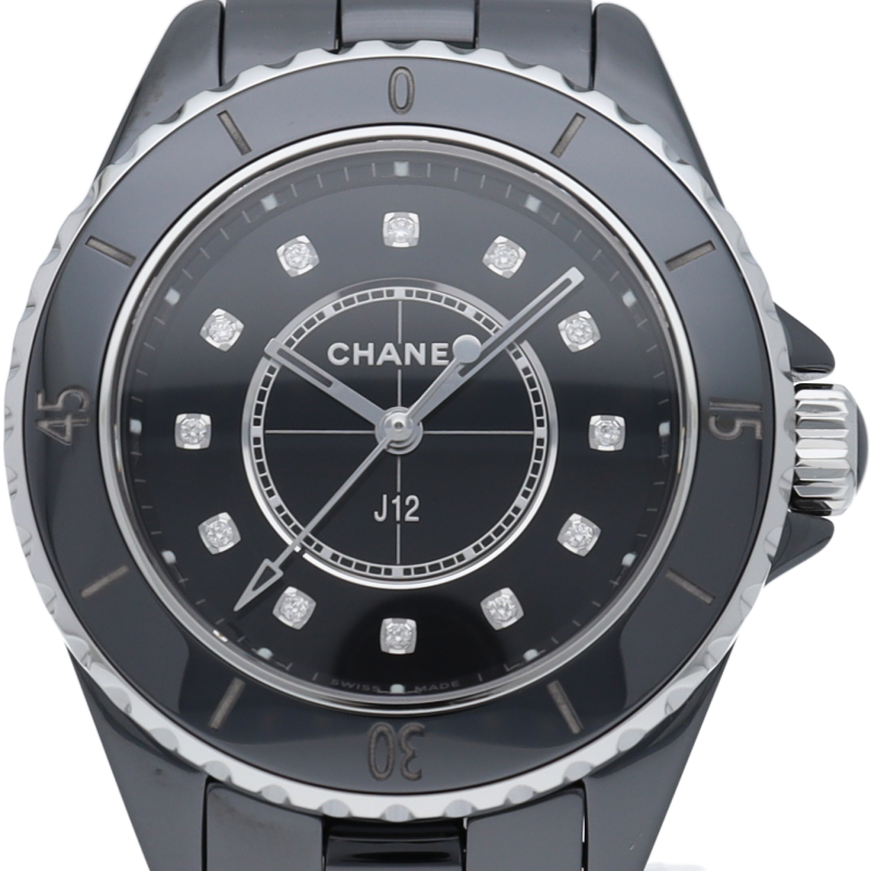 シャネルの人気フラッグシップウォッチで「J12」。異素材で傷がつきにくく独特な光沢感をもつセラミックを使用、文字盤には12Pダイヤが施されて高級感ある1本。