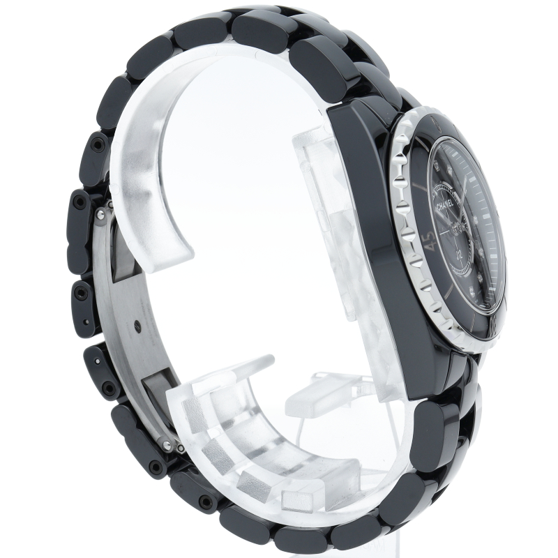 シャネルの人気フラッグシップウォッチで「J12」。異素材で傷がつきにくく独特な光沢感をもつセラミックを使用、文字盤には12Pダイヤが施されて高級感ある1本。