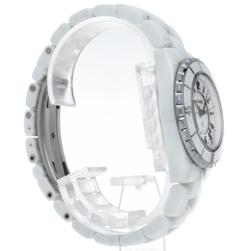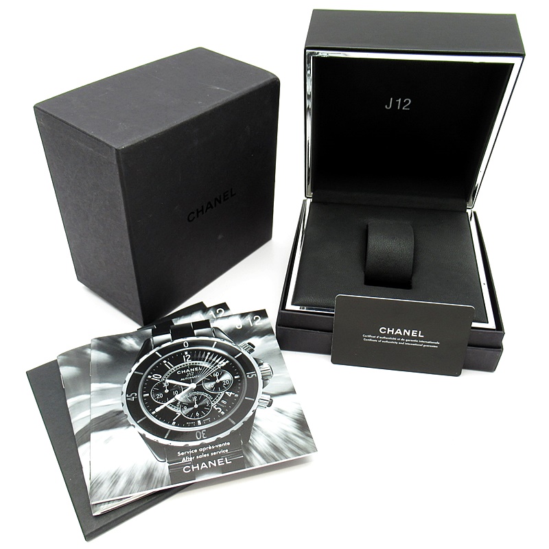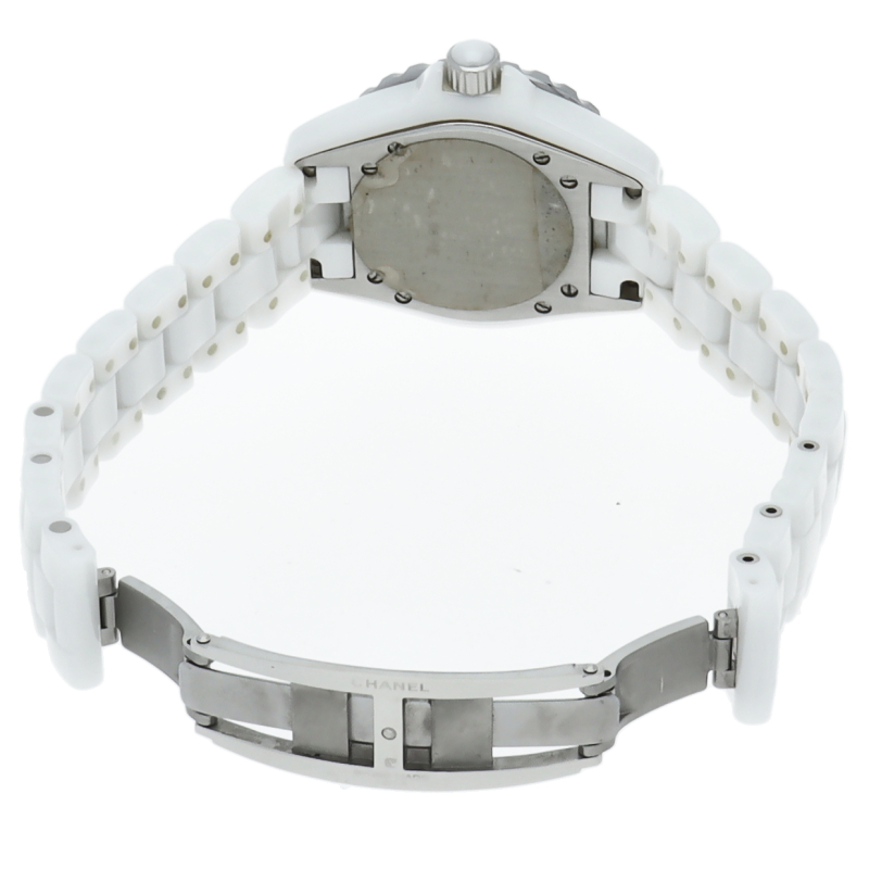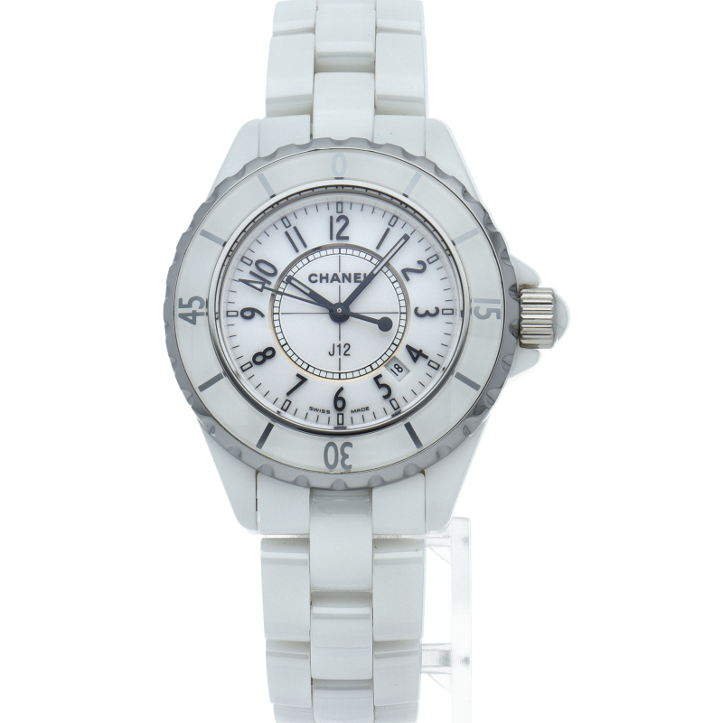 シャネルの人気フラッグシップウォッチで「J12」。異素材で傷がつきにくく独特な光沢感をもつセラミックをうまくデザインに融合させた1本。