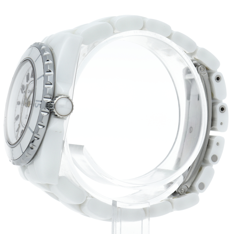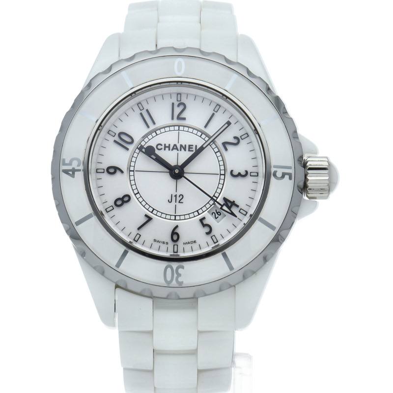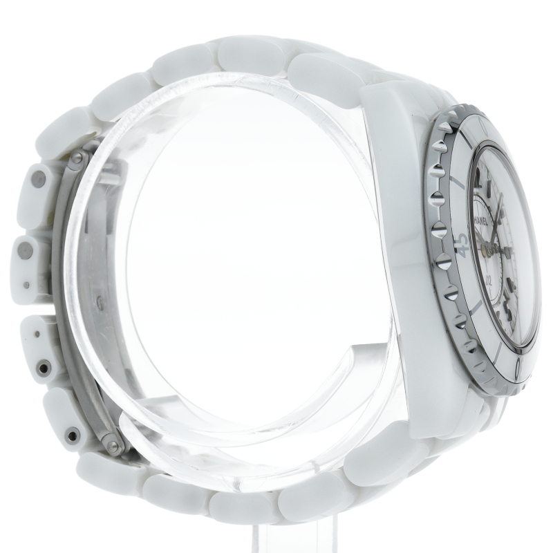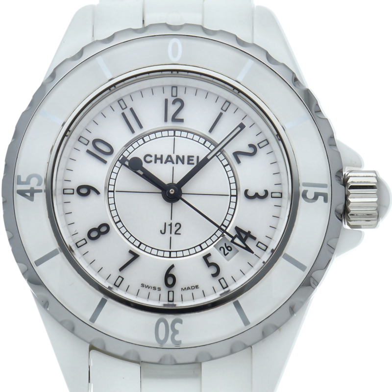 シャネルの人気フラッグシップウォッチで「J12」。異素材で傷がつきにくく独特な光沢感をもつセラミックをうまくデザインに融合させた1本。