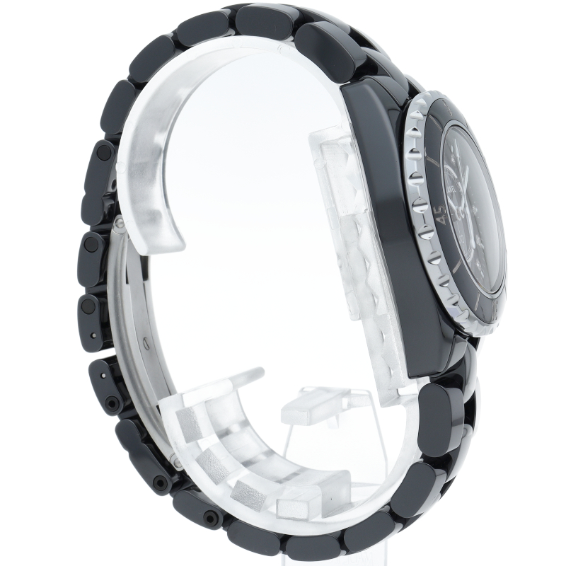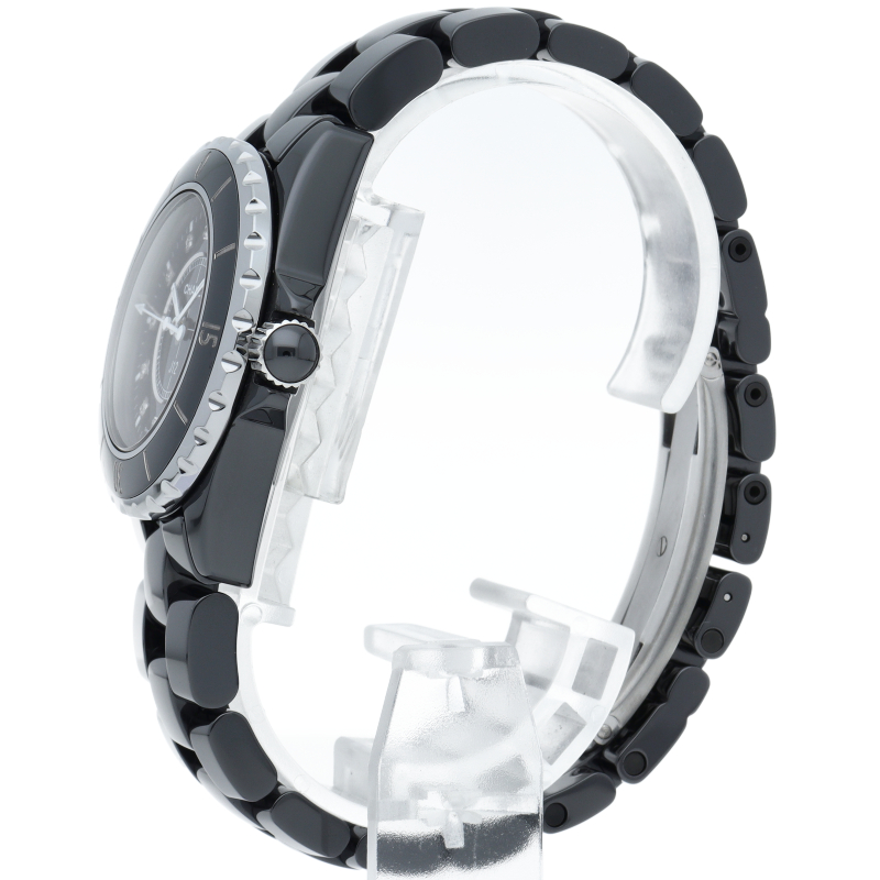 シャネルの人気フラッグシップウォッチで「J12」。異素材で傷がつきにくく独特な光沢感をもつセラミックを使用、文字盤には12Pダイヤが施されて高級感ある1本。