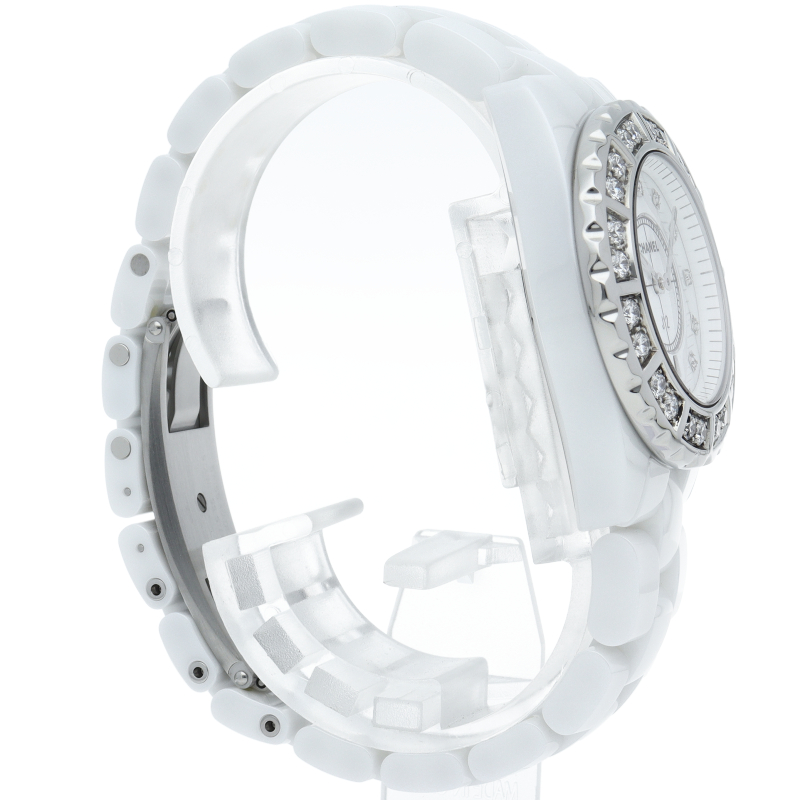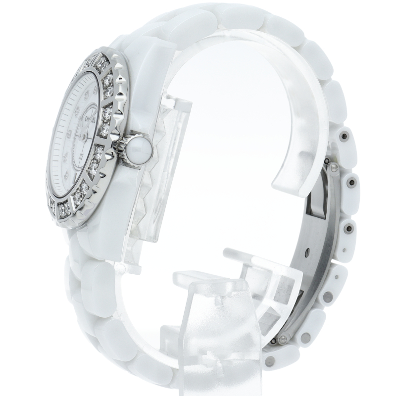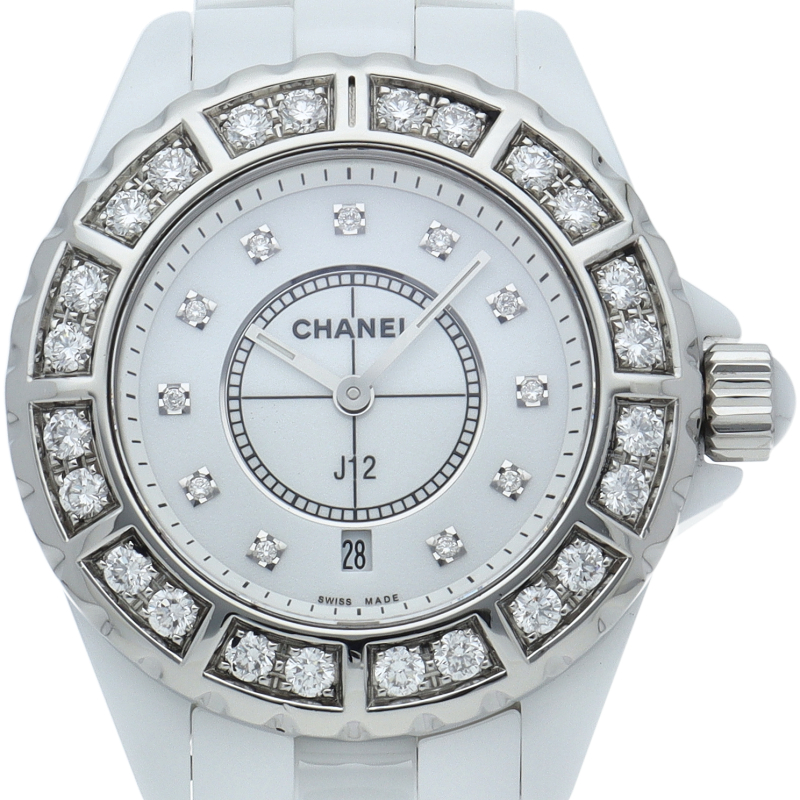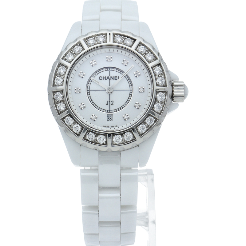シャネルの人気フラッグシップウォッチで「J12」。異素材で傷がつきにくく独特な光沢感をもつセラミックをうまくデザインに融合させた1本。11Pダイヤモンド。