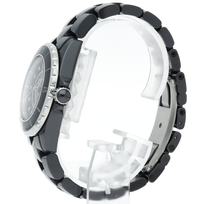 シャネルの人気フラッグシップウォッチで「J12」。異素材で傷がつきにくく独特な光沢感をもつセラミックを使用、文字盤には12Pダイヤが施されて高級感ある1本。