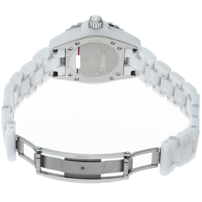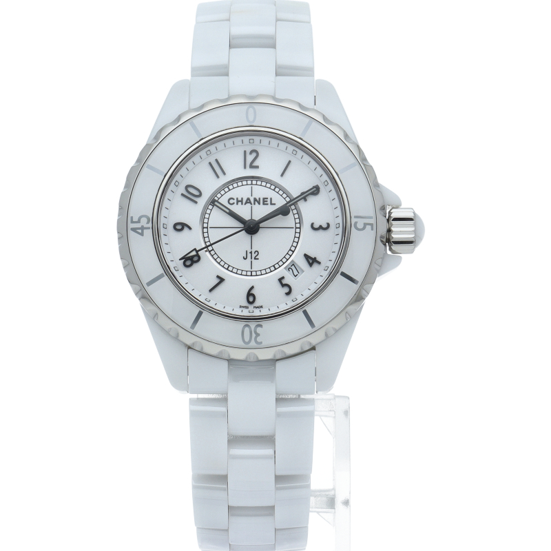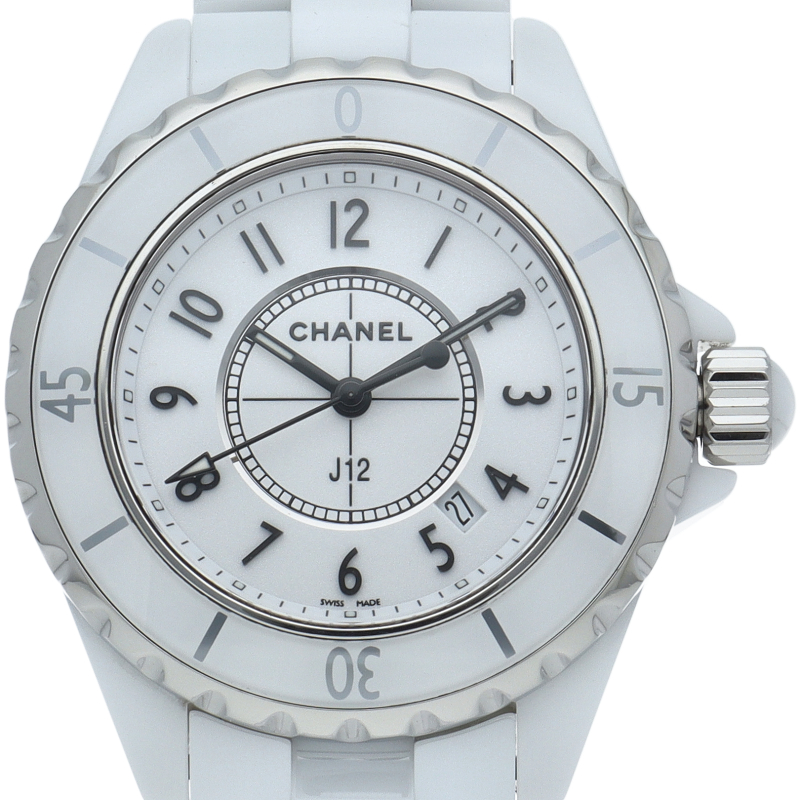 シャネルの人気フラッグシップウォッチで「J12」。異素材で傷がつきにくく独特な光沢感をもつセラミックをうまくデザインに融合させた1本。