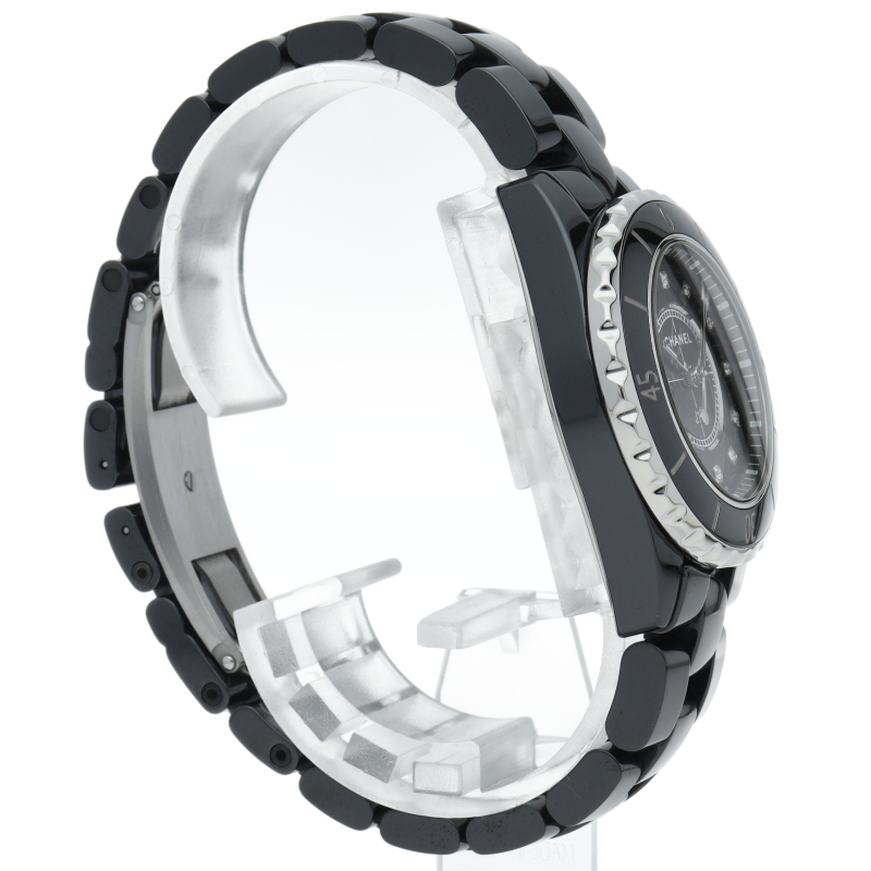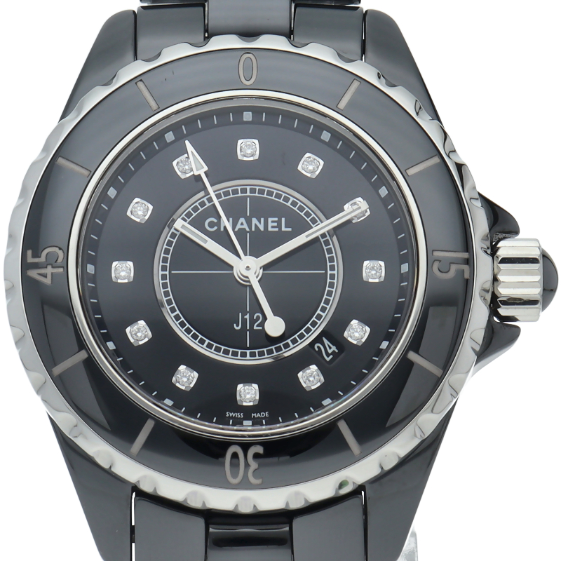 シャネルの人気フラッグシップウォッチで「J12」。異素材で傷がつきにくく独特な光沢感をもつセラミックを使用、文字盤には12Pダイヤが施されて高級感ある1本。