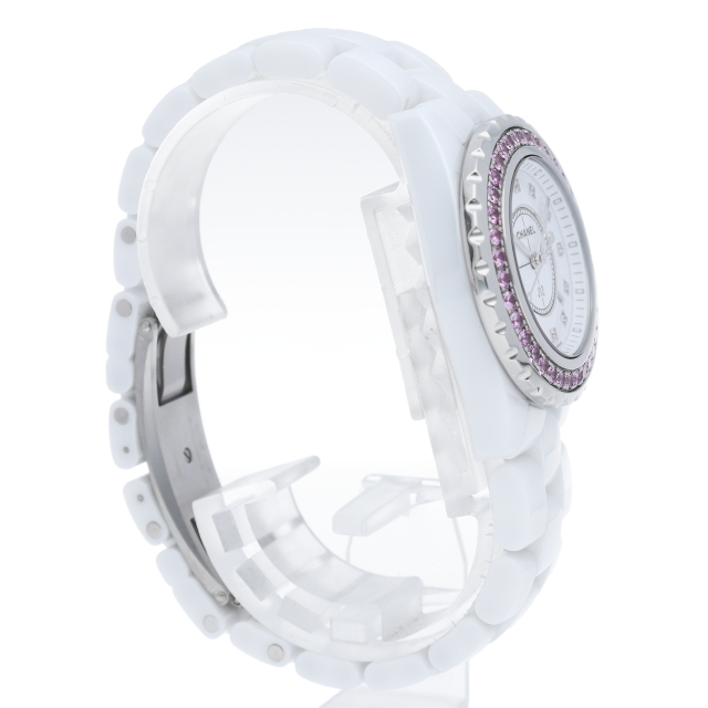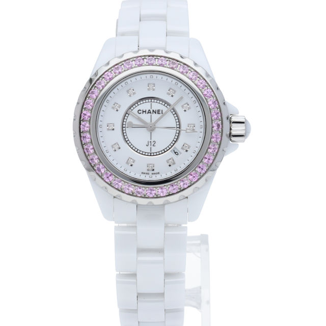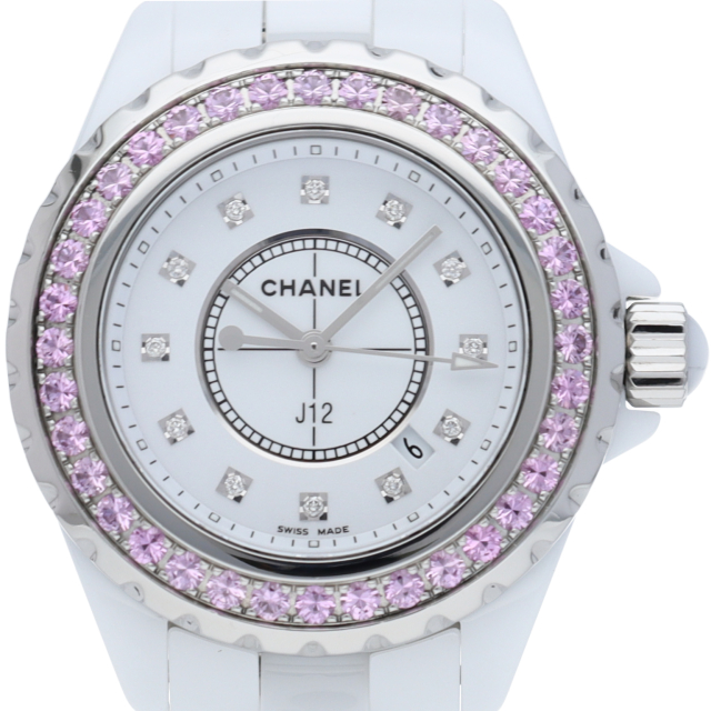 シャネルの人気ウォッチの「J12」。異素材で傷がつきにくく独特な光沢感をもつセラミックを使用。インデックスには12ポイントのダイヤモンドが輝き、ピンクサファイアが施されたベゼルは高級感のある逸品です。