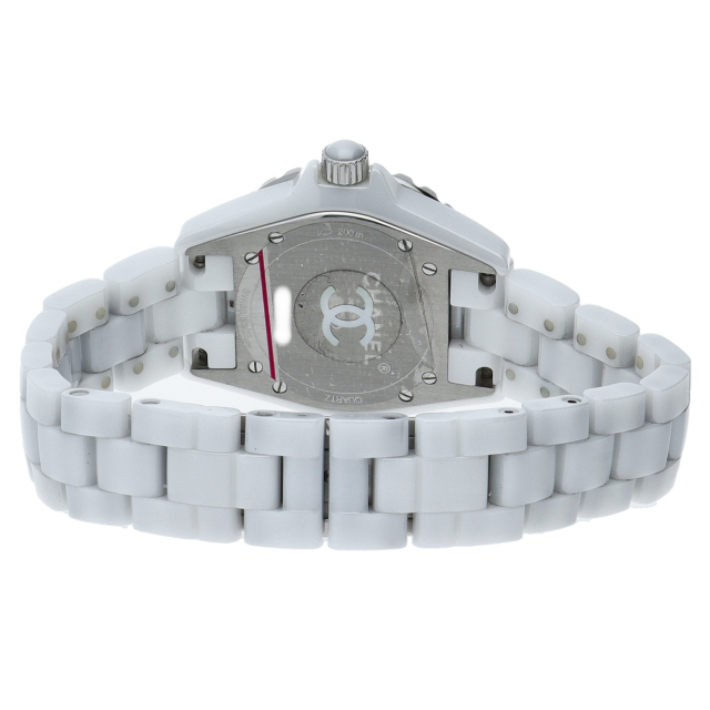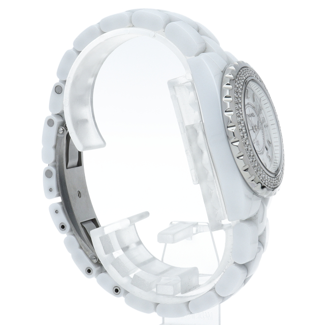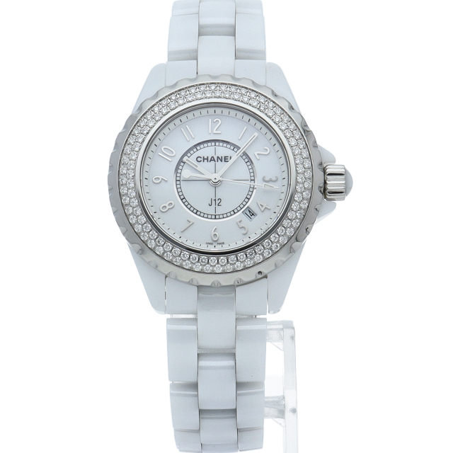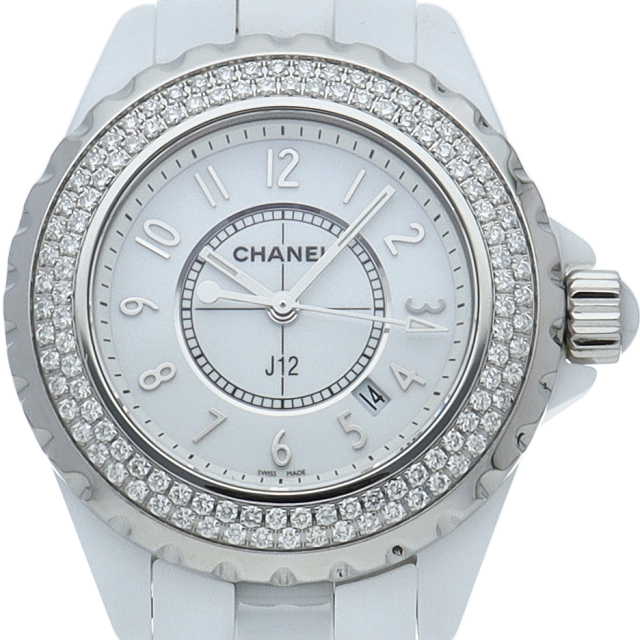 シャネルの人気フラッグシップウォッチで「J12」。異素材で傷がつきにくく独特な光沢感をもつセラミックをうまくデザインに融合させた1本。ゴージャスなベゼルダイヤが目をひきます。