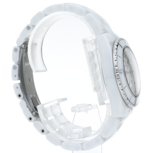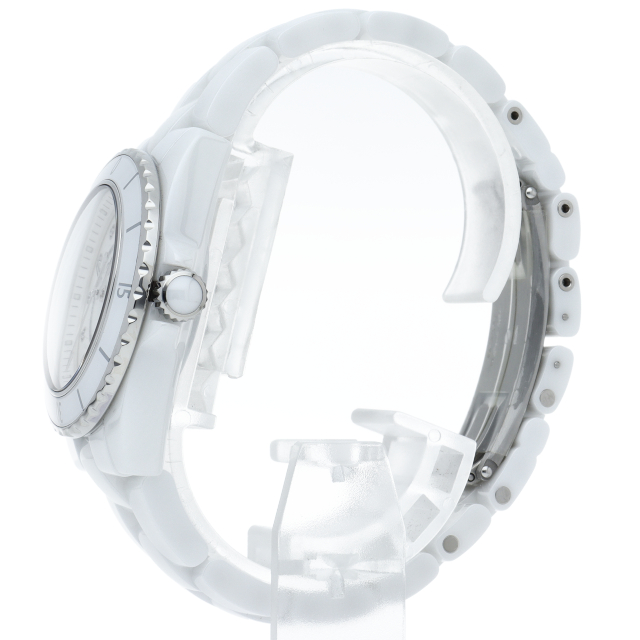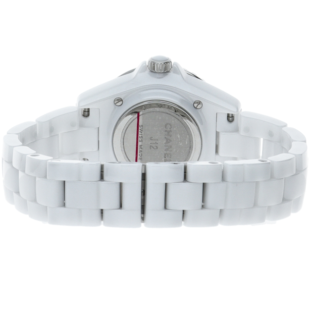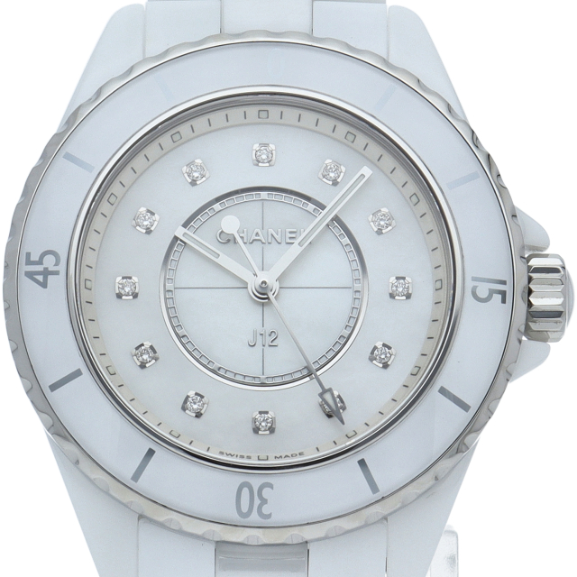 シャネルの人気フラッグシップウォッチで「J12」。異素材で傷がつきにくく独特な光沢感をもつセラミックをうまくデザインに融合させた1本。こちらはホワイトシェルダイヤルに12Pダイヤモンドを配したラグジュアリーなモデルです。