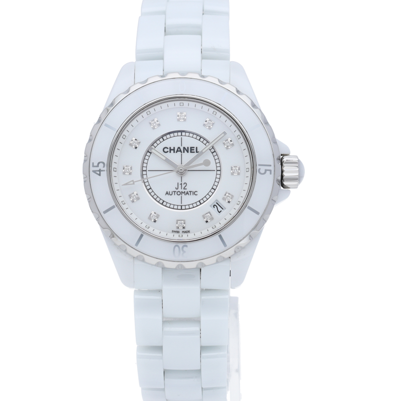 シャネルの人気フラッグシップウォッチで「J12」。異素材で傷がつきにくく独特な光沢感をもつセラミックをうまくデザインに融合させた1本。12Pダイヤモンド。