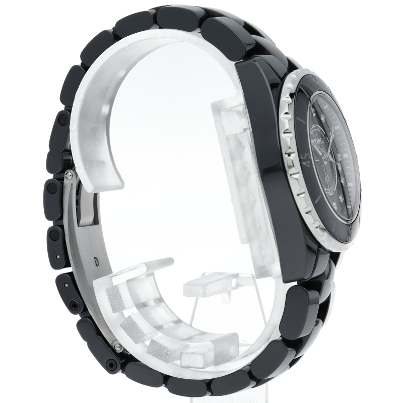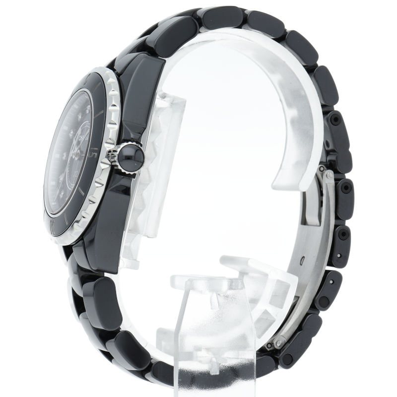 シャネルの人気フラッグシップウォッチで「J12」。異素材で傷がつきにくく独特な光沢感をもつセラミックを使用、文字盤には12Pダイヤが施されて高級感ある1本。
