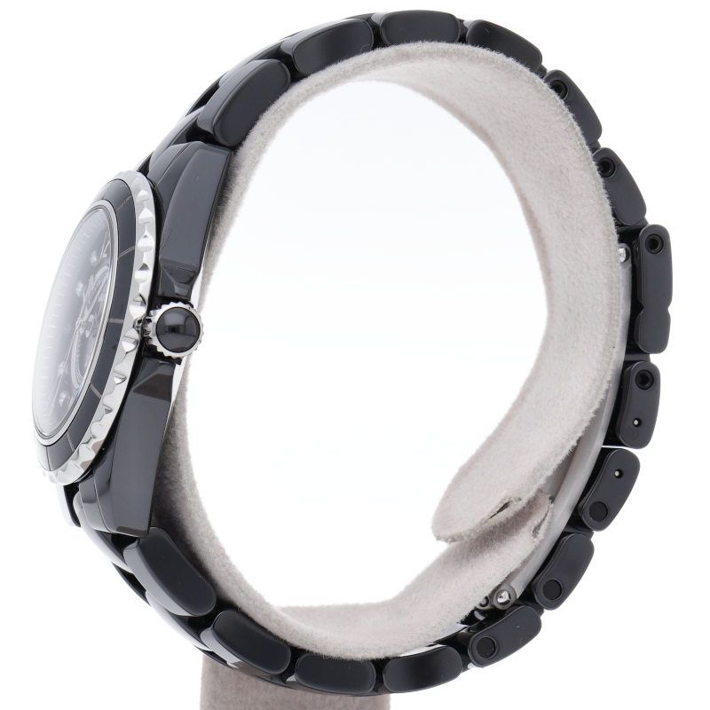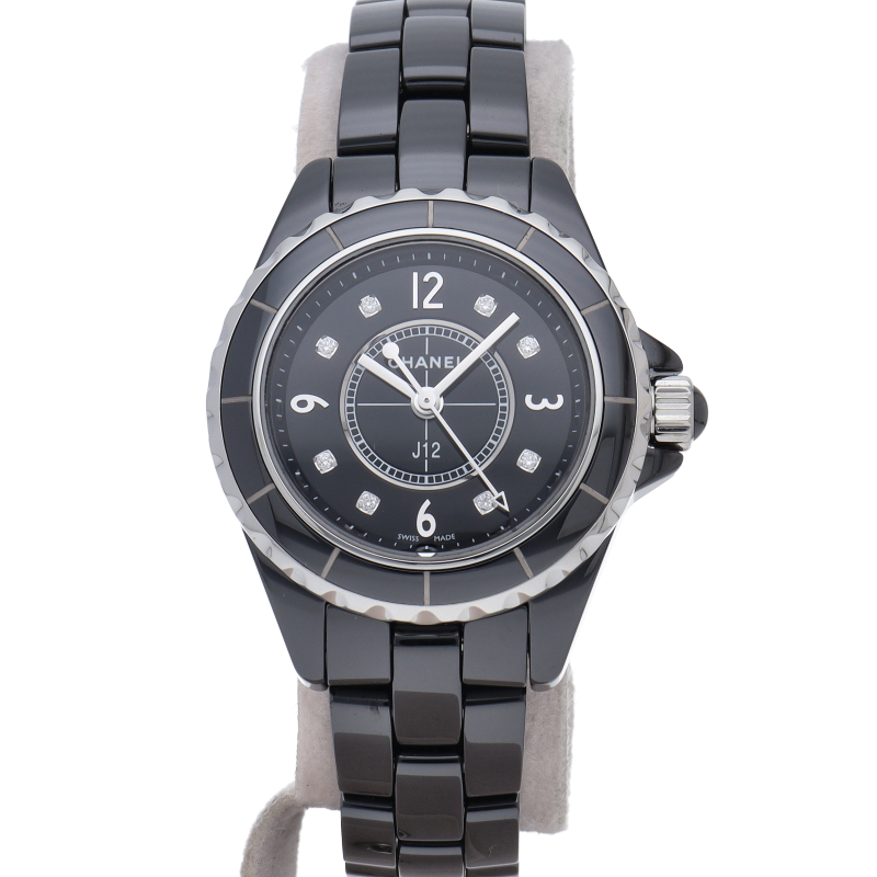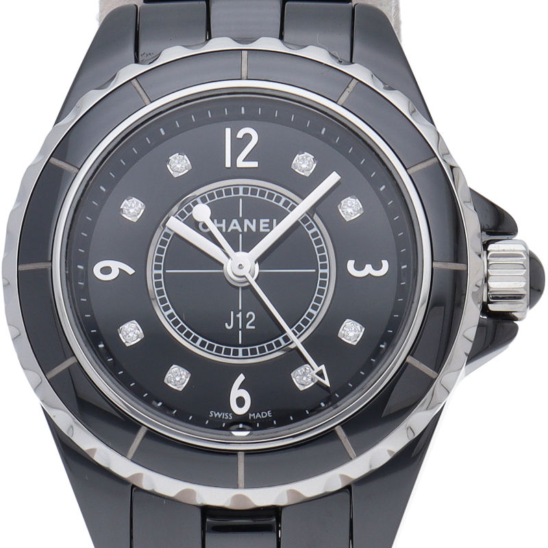 シャネルの人気フラッグシップウォッチの「J12」。独特な光沢感を持つセラミックを使用、文字盤にはダイヤモンドを施した高級感溢れる1本。女性にピッタリの29ミリサイズです。