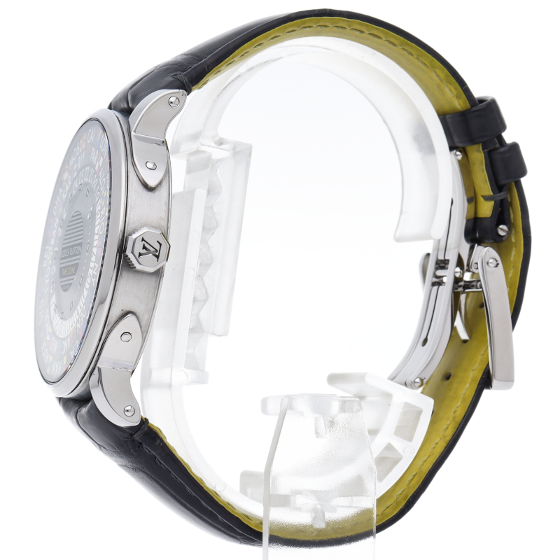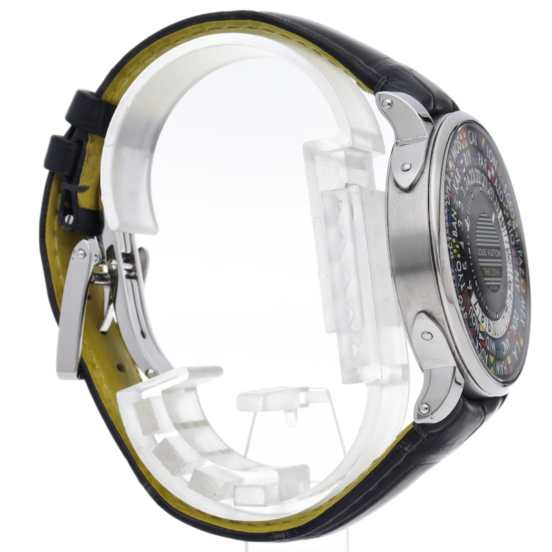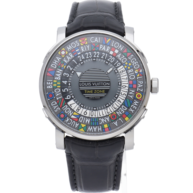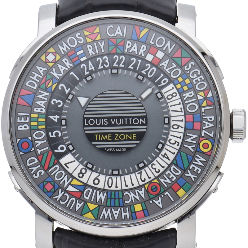 ルイ・ヴィトン トランクから着想を得たユニークでカラフルなデザインのタイムピース「エスカル タイムゾーン」。時計製造アトリエ「ラ・ファブリク・デュ・タン・ルイ・ヴィトン」で開発された、24ヶ国のタイムゾーンを表示する機能を搭載しています。