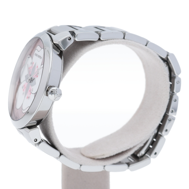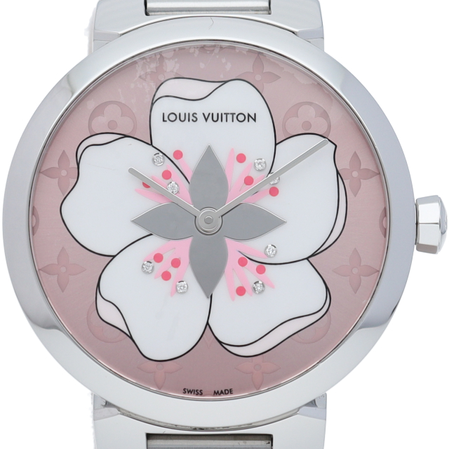 ルイ・ヴィトンのフラッグシップウォッチ「タンブール」。上品かつシンプルなデザインで爽やかにお使いいただけます。文字盤には桜と8個のダイヤをあしらうなど細かいディテールにこだわり抜いた逸品です。