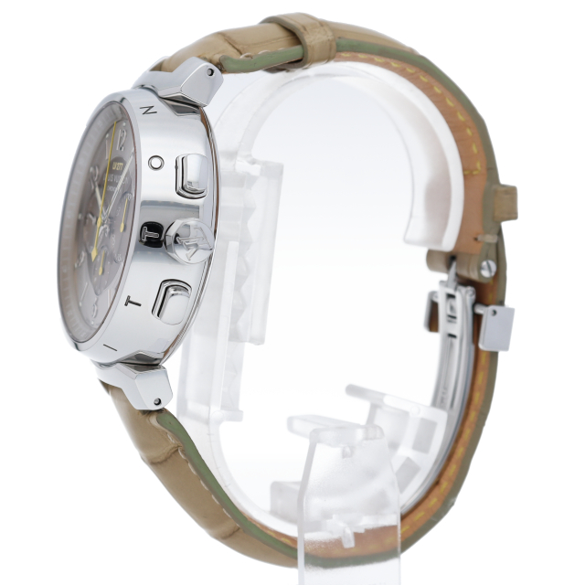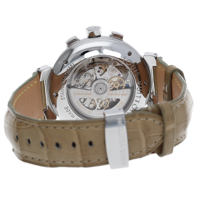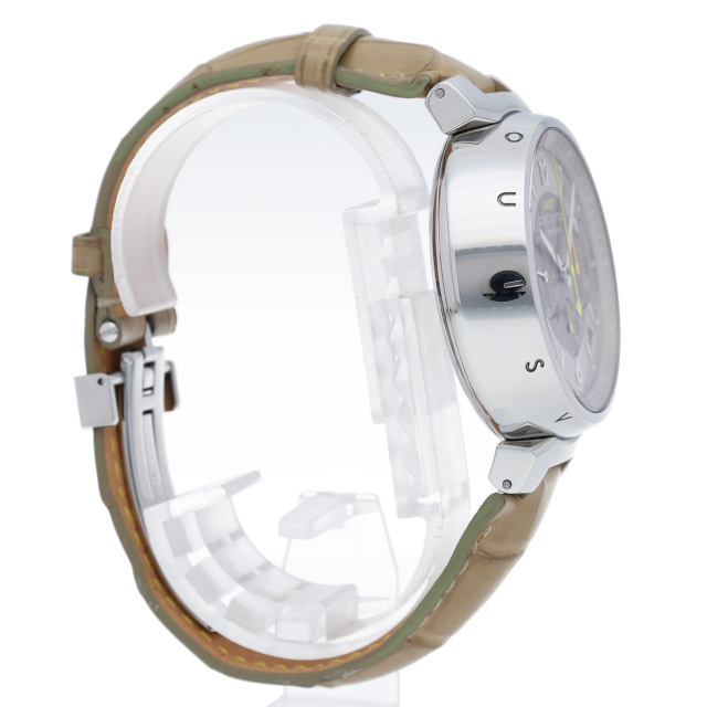 丸みのある独特のタンブールケースにゼニスのハイビートキャリバー「エル・プリメロ」を搭載したタンブールシリーズの最上位モデルです。ケース側面にはLOUIS VUITTONのブランドネームが記されています。フォーマルとカジュアルの双方の雰囲気を持ったモデルです。世界限定277本モデル。