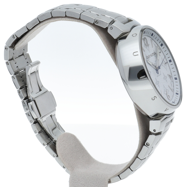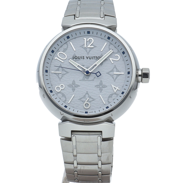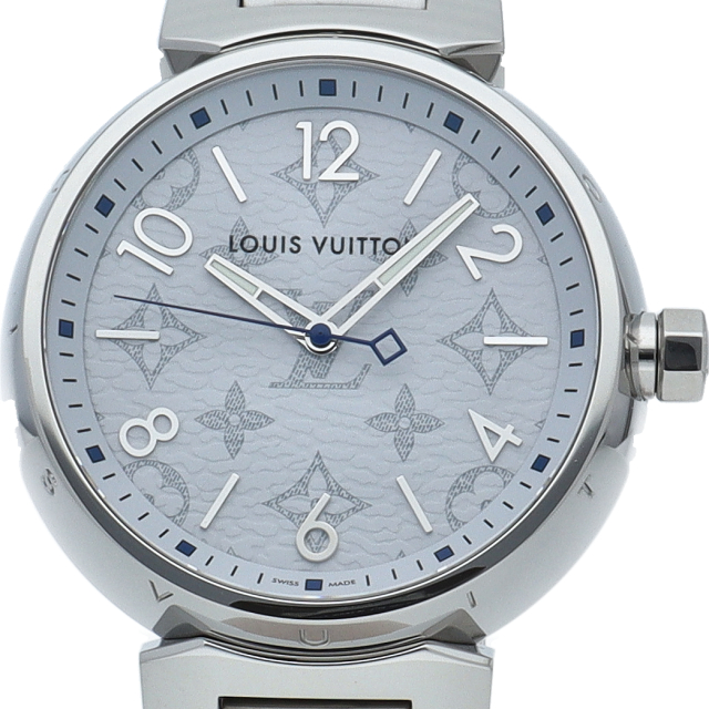 ルイ・ヴィトンのフラッグシップウォッチ「タンブール」。ルイヴィトンが伝統的に大切にしてきたモノグラムを文字盤デザインにあしらった、アイコニックな傑作モデル。安心の100m防水、さらに扱いやすいクォーツムーブメントを搭載しており、忙しい毎日を送るビジネスマンにもオススメです。