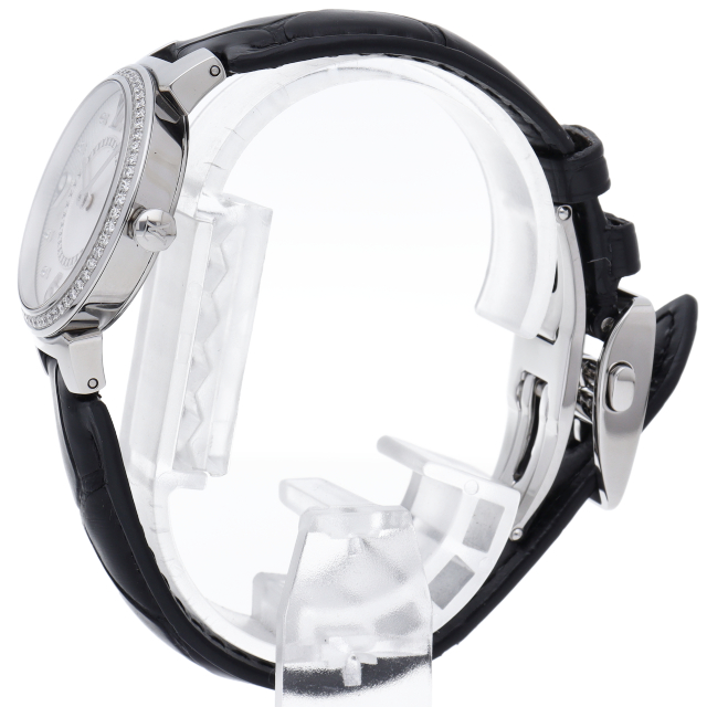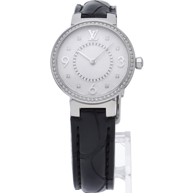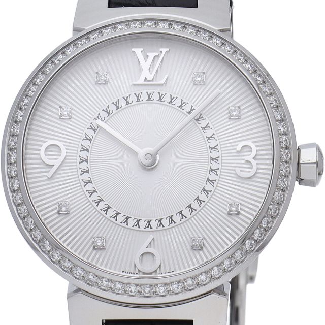 ルイ・ヴィトンのフラッグシップウォッチ「タンブール」。上品でシンプルなデザインでどんなスタイルにも合わせられます。ベゼルにはダイヤモンドが施された高級感溢れる1本です。