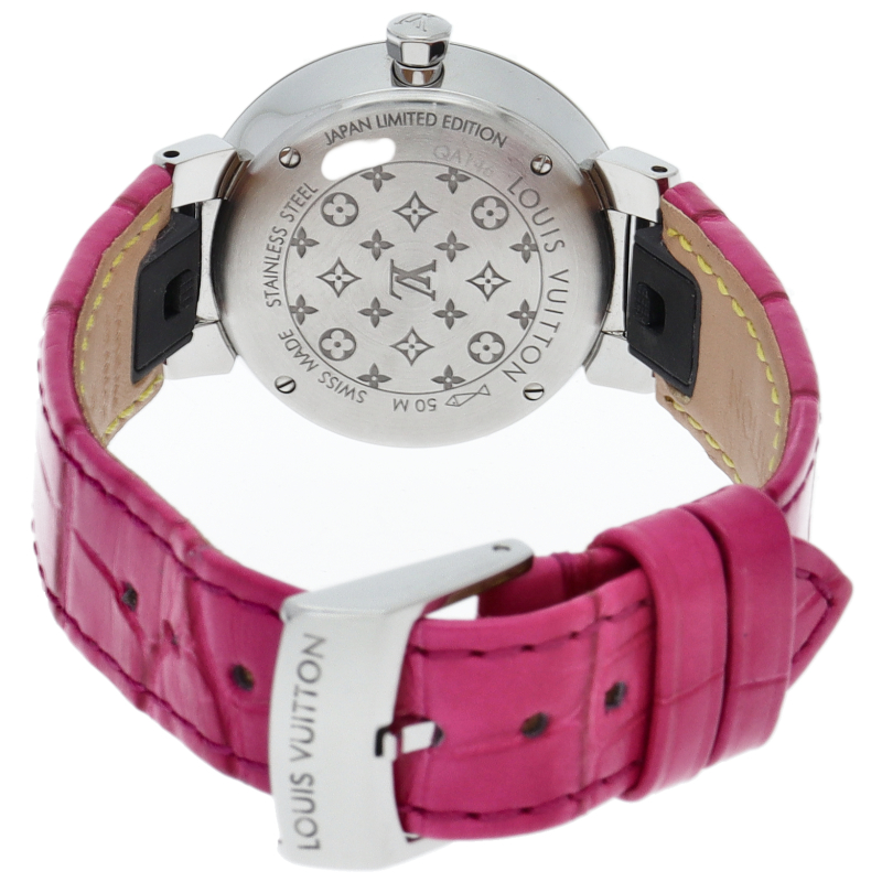 ルイ・ヴィトンのアイコンウォッチ「タンブール」のオリジナルデザインを踏襲しつつも、シンプルかつ美しいフォルムに仕上げた「タンブール スリム」。カラフルな文字盤の中心にはフューシャピンクのモノグラム・フラワーモチーフを、その周りにはミラーポリッシュ仕上げを施したロジン・パターンのサークルを配置。コントラストが際立ちます。