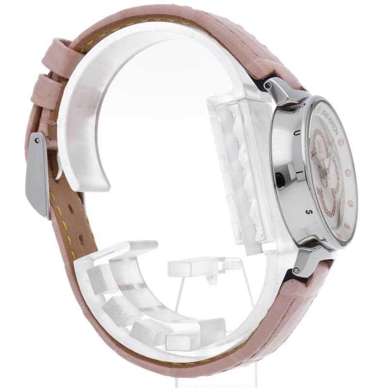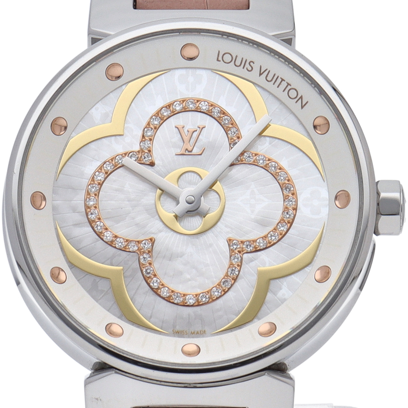 ルイヴィトンが作る太鼓を意味する独特のラウンドケースのルイ・ヴィトンを代表するウォッチモデル「タンブール」。こちらは艶やかで美しいホワイト マザー・オブ・パールのダイアルを持つモデルです。また、花を形取ったダイヤモンドは可愛らしく、華やかな印象を持ちます。