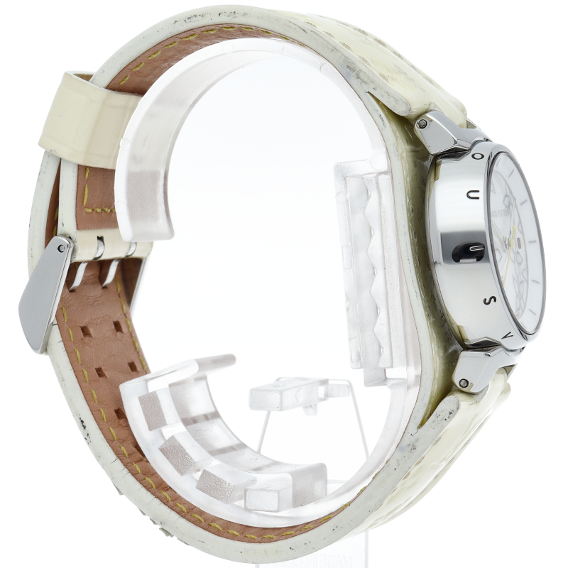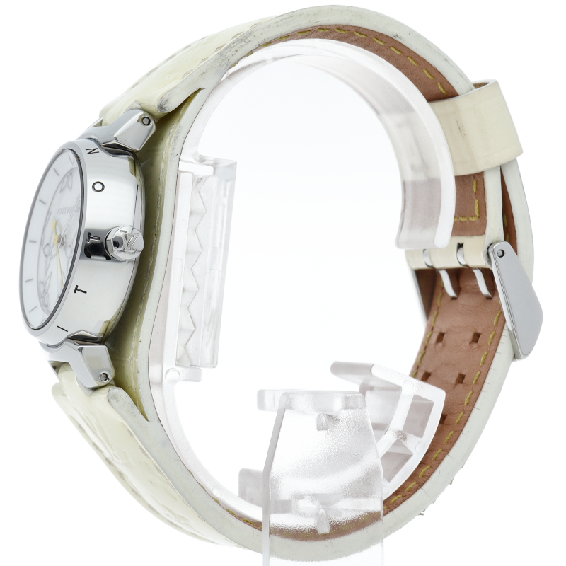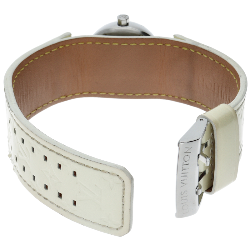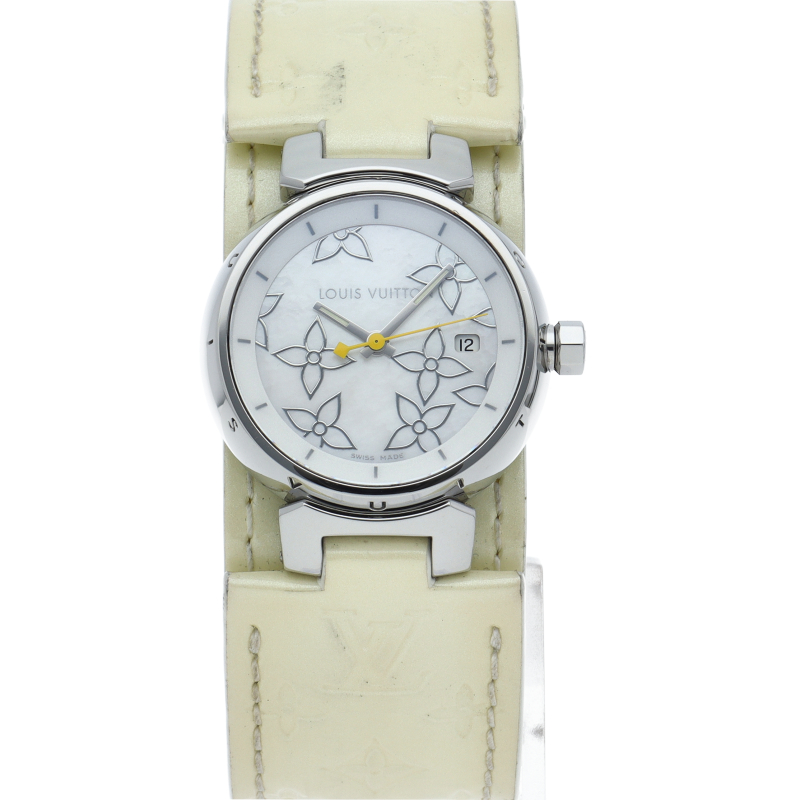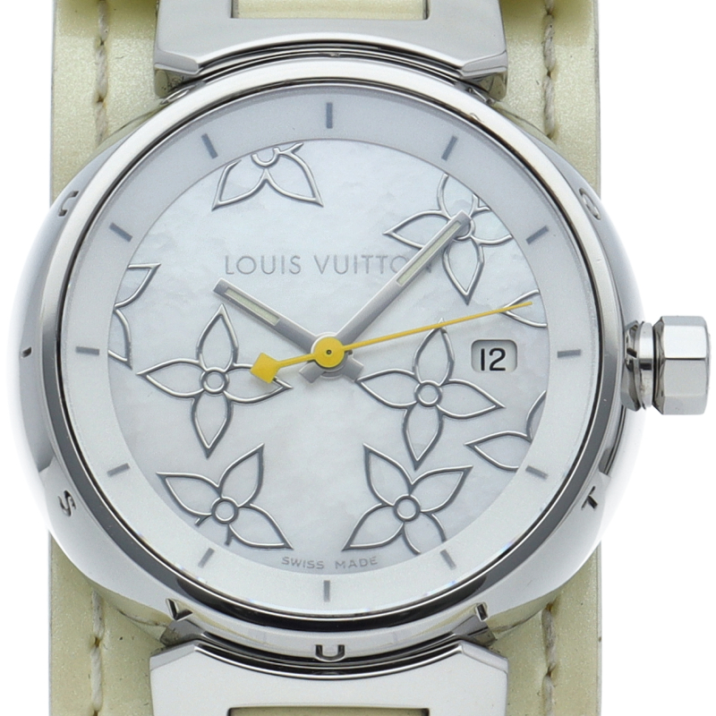 2002年のコレクション誕生以来、絶大な人気を誇る「タンブール」。ルイ・ヴィトンならではの現代の女性の為のリストウォッチです。ダイヤルにホワイトシェルを用いることで、可愛らしさと高級感を演出しています。