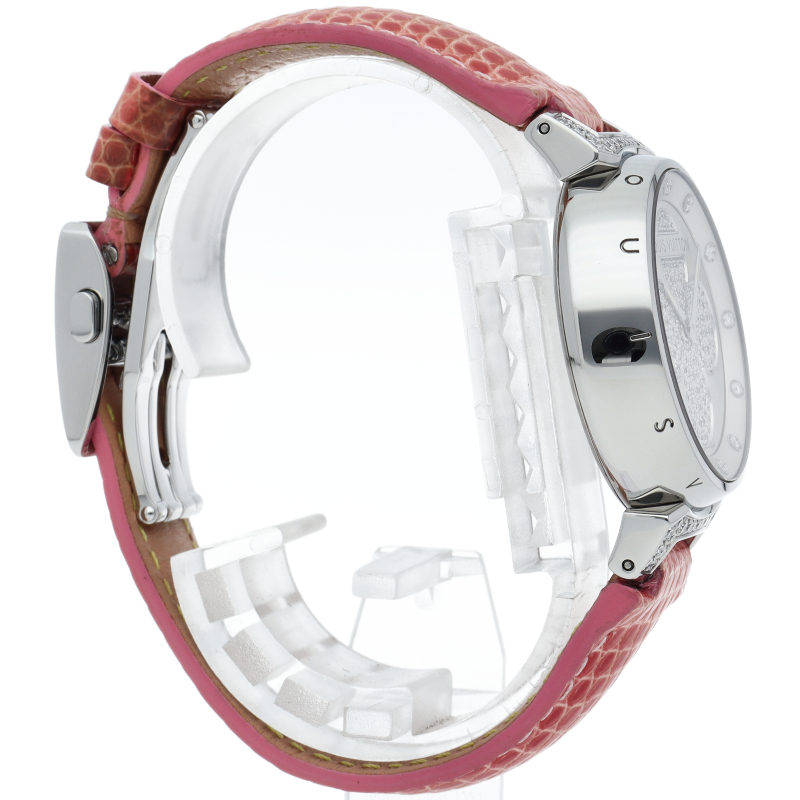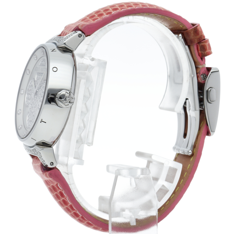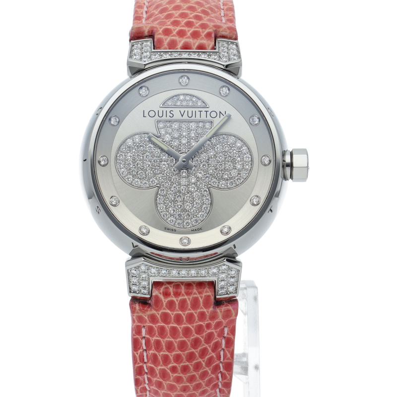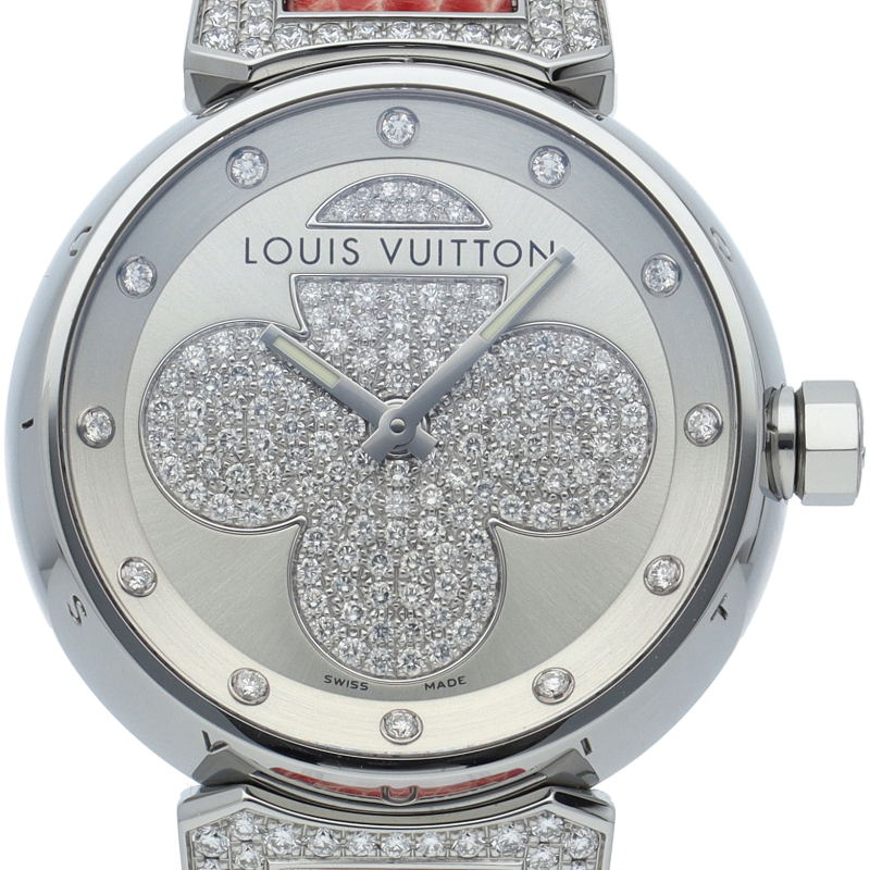 ルイ・ヴィトンのフラッグシップウォッチ「タンブール」。フォーマルにでもカジュアルにでも合わせられる便利な1本。ラグ部分と文字盤にはダイヤが贅沢にあしらわれ、とてもかわいらしい商品となっております。