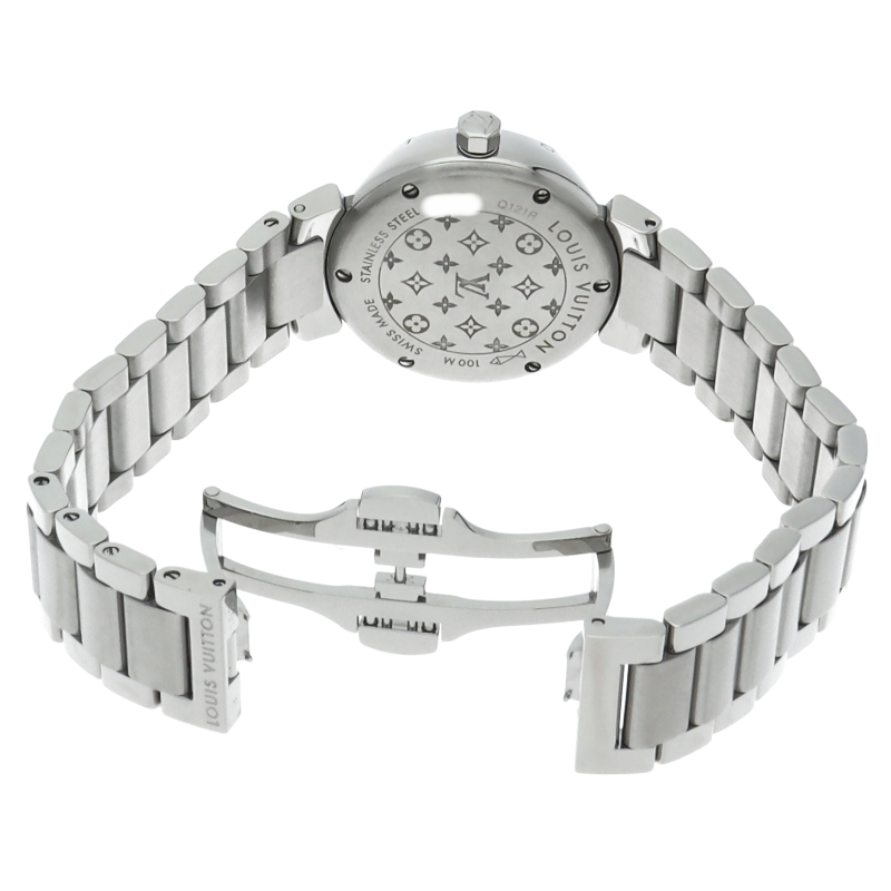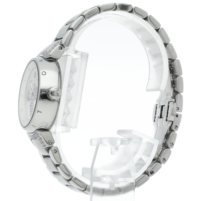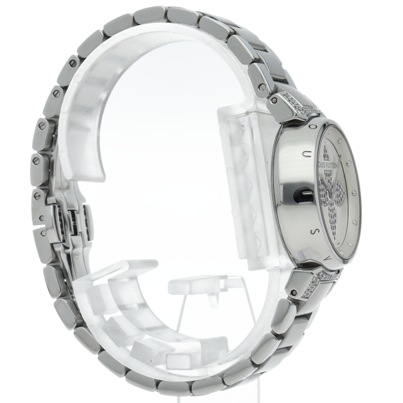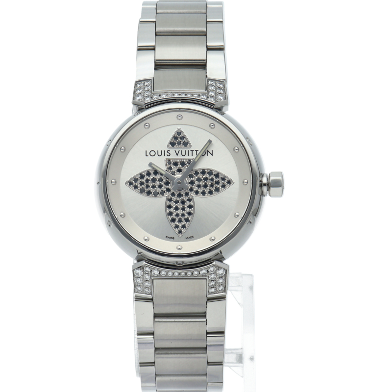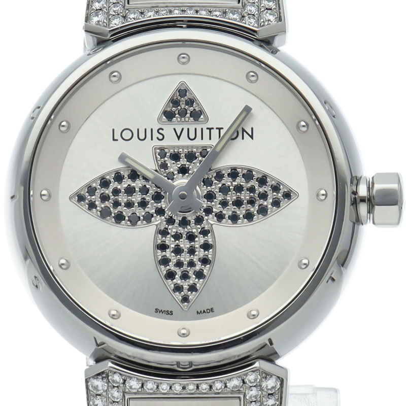 ルイ・ヴィトンのフラッグシップウォッチ「タンブール」。フォーマルにでもカジュアルにでも合わせられる便利な1本。ラグ部分と文字盤にはブラックダイヤが贅沢にあしらわれかわいらしい商品となっております。